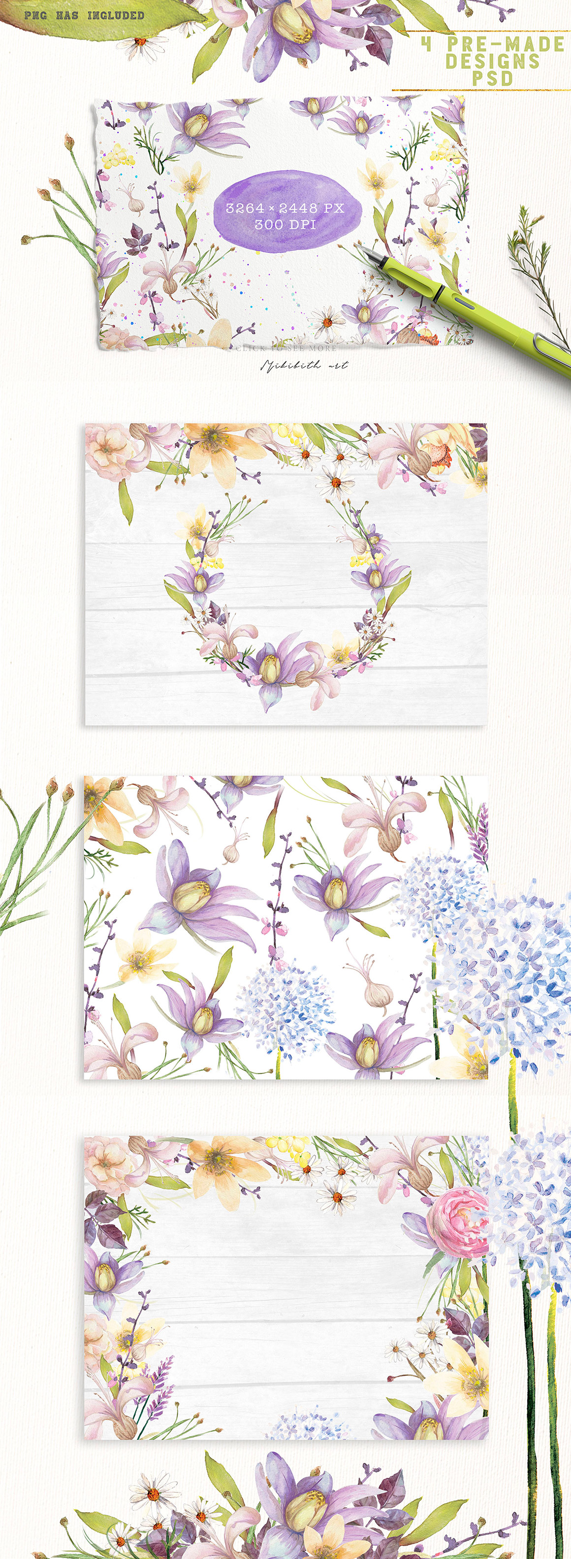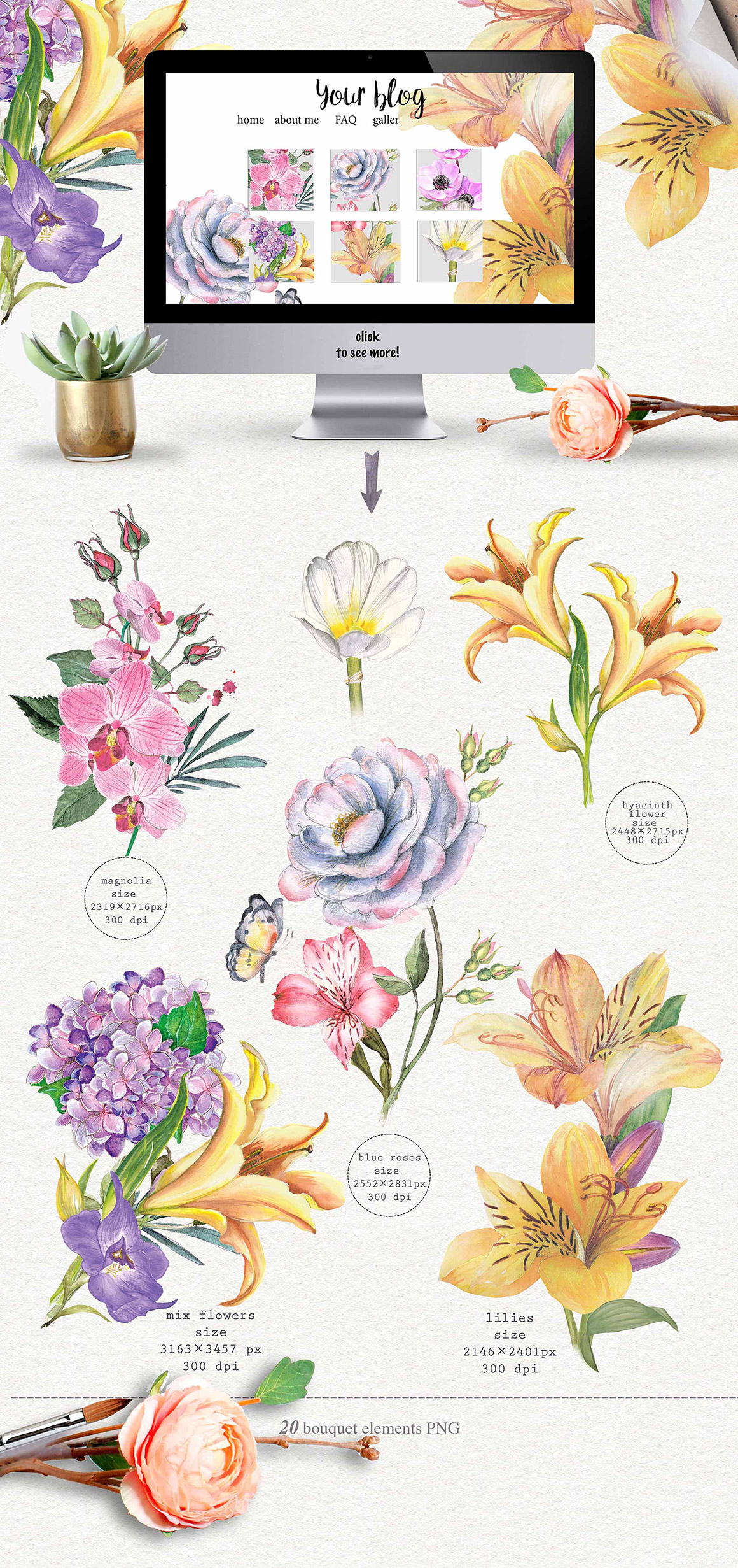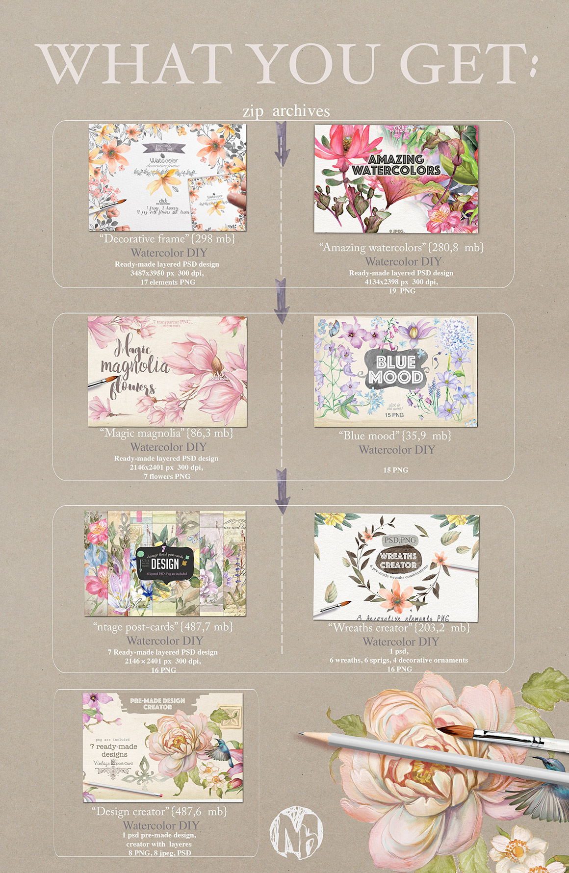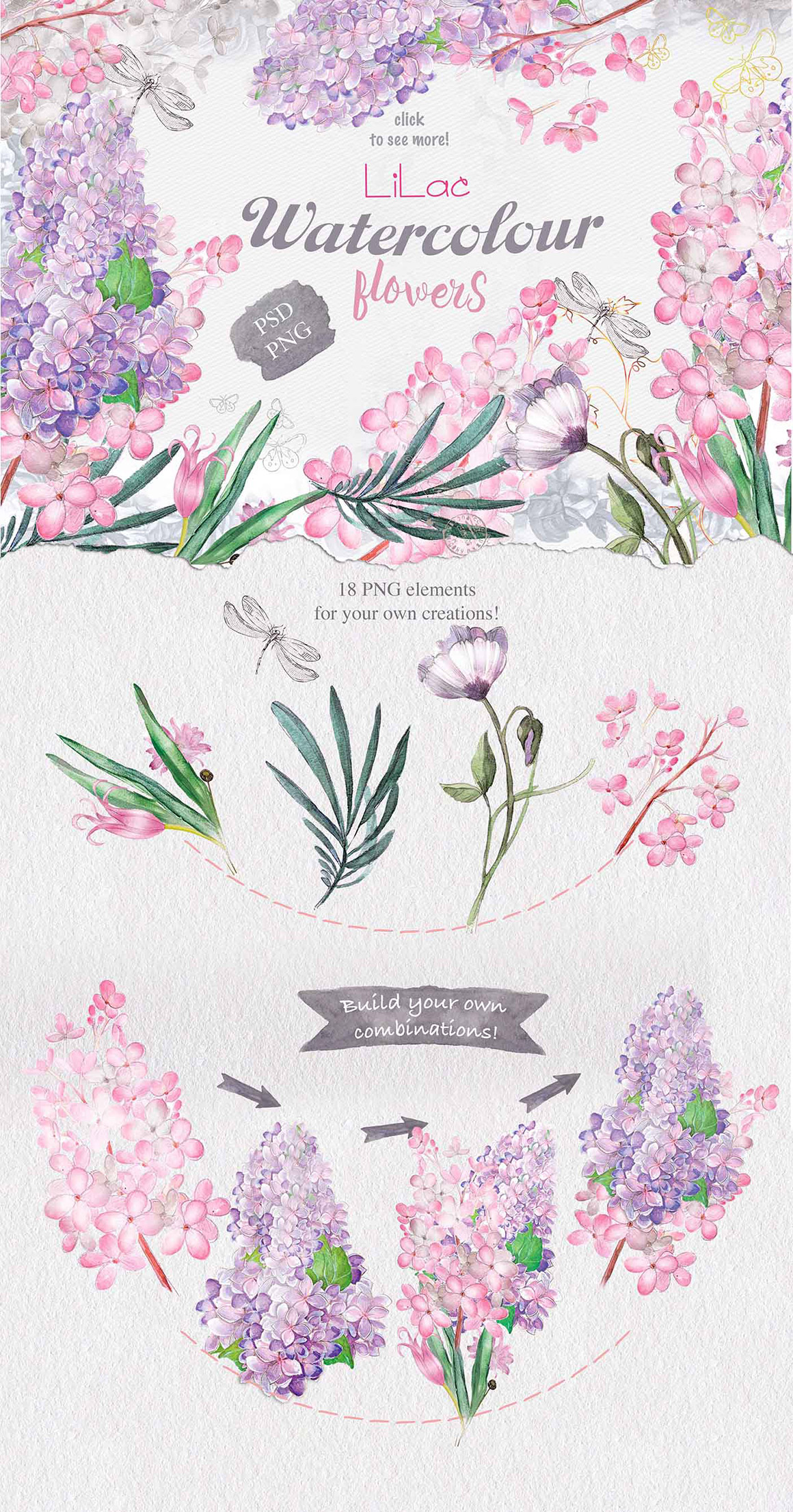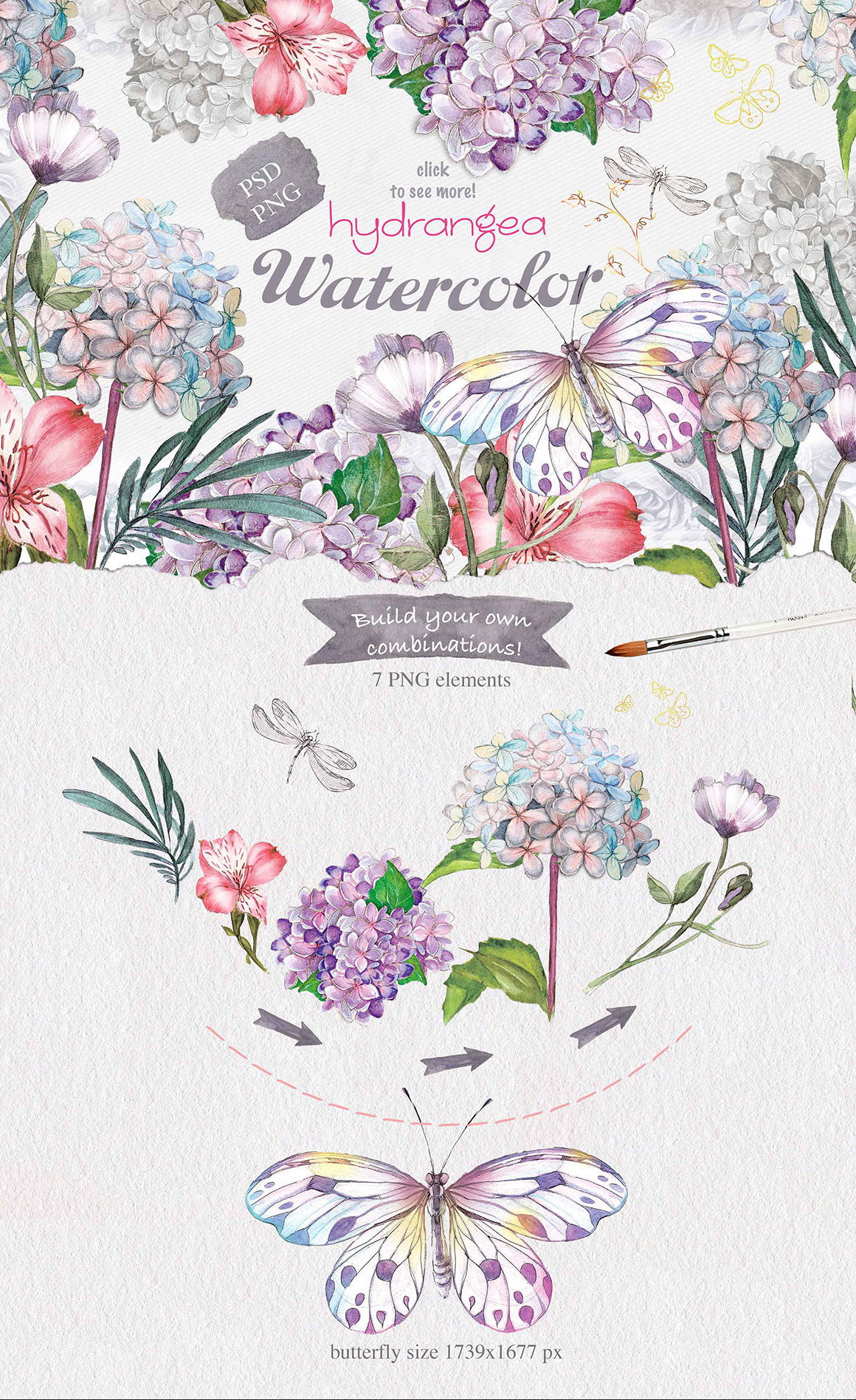 I’m so glad to introduce to you this art collection !! There are more than 85 PNG and 7 Psd files with watercolor floral elements on the transparent PNG and layered PSD !