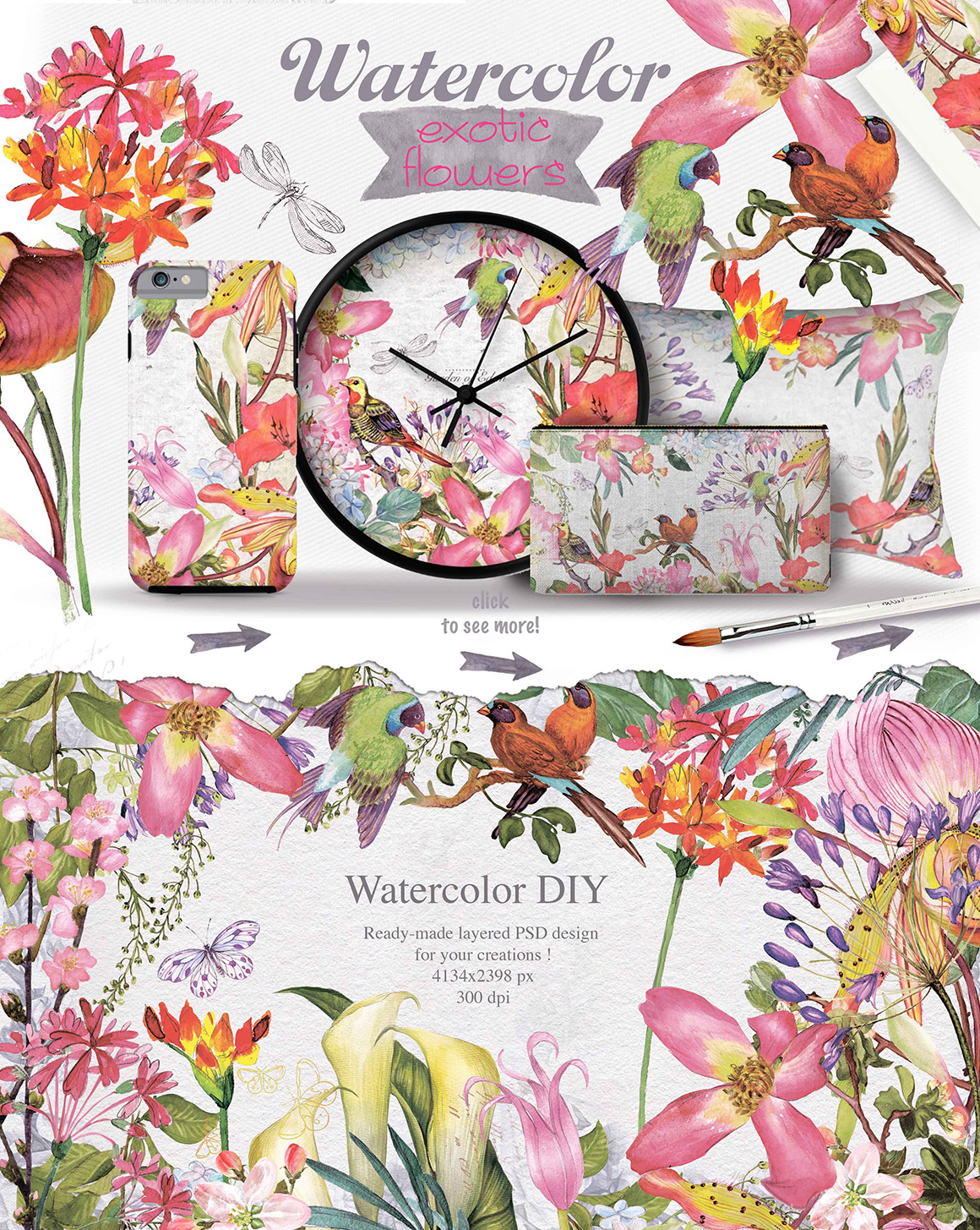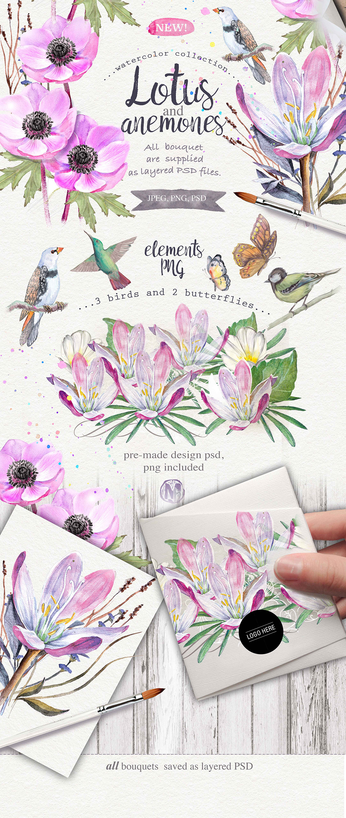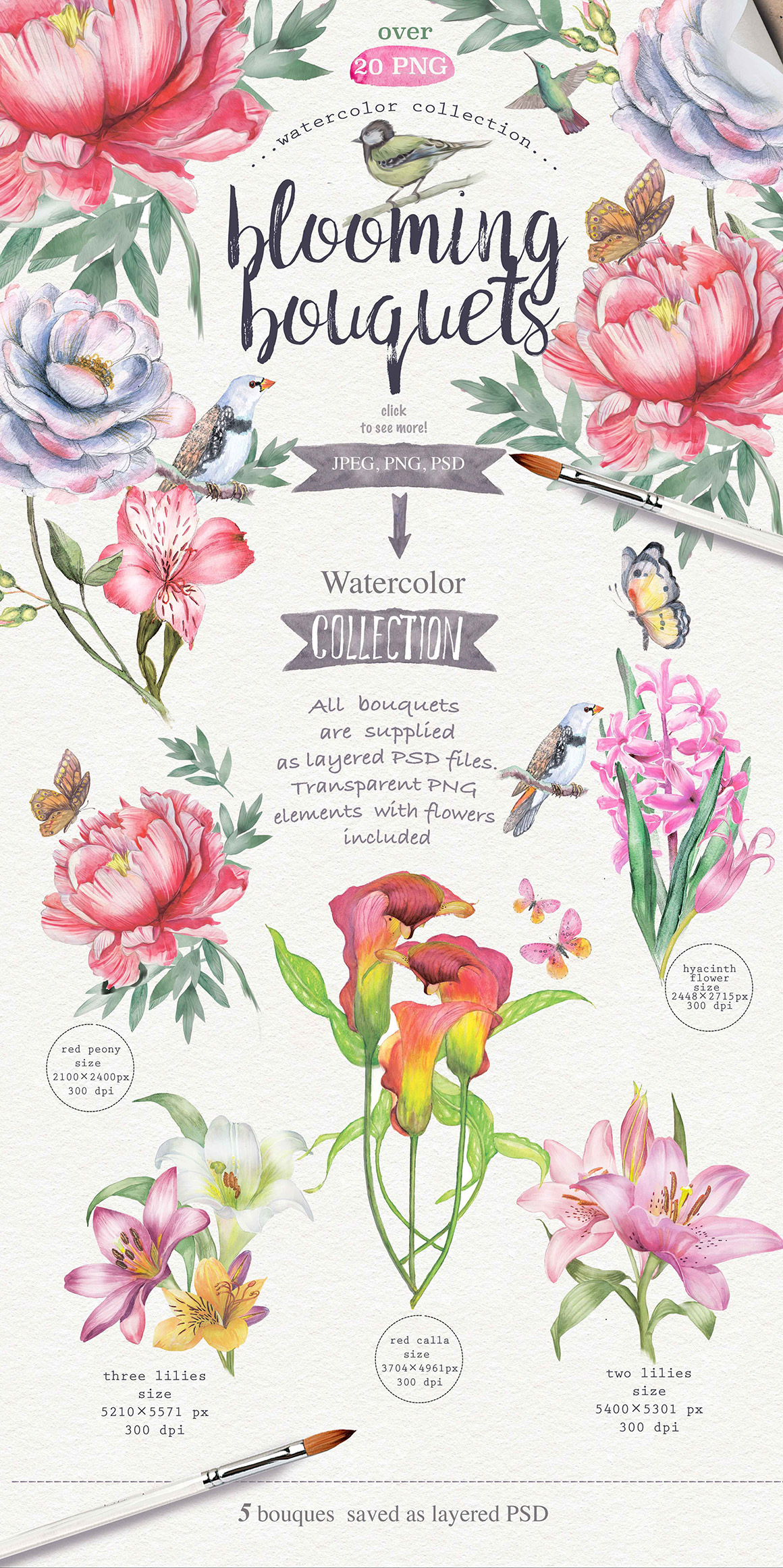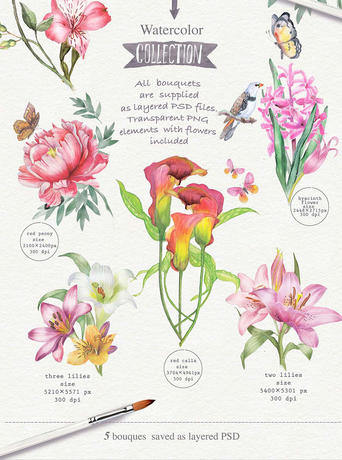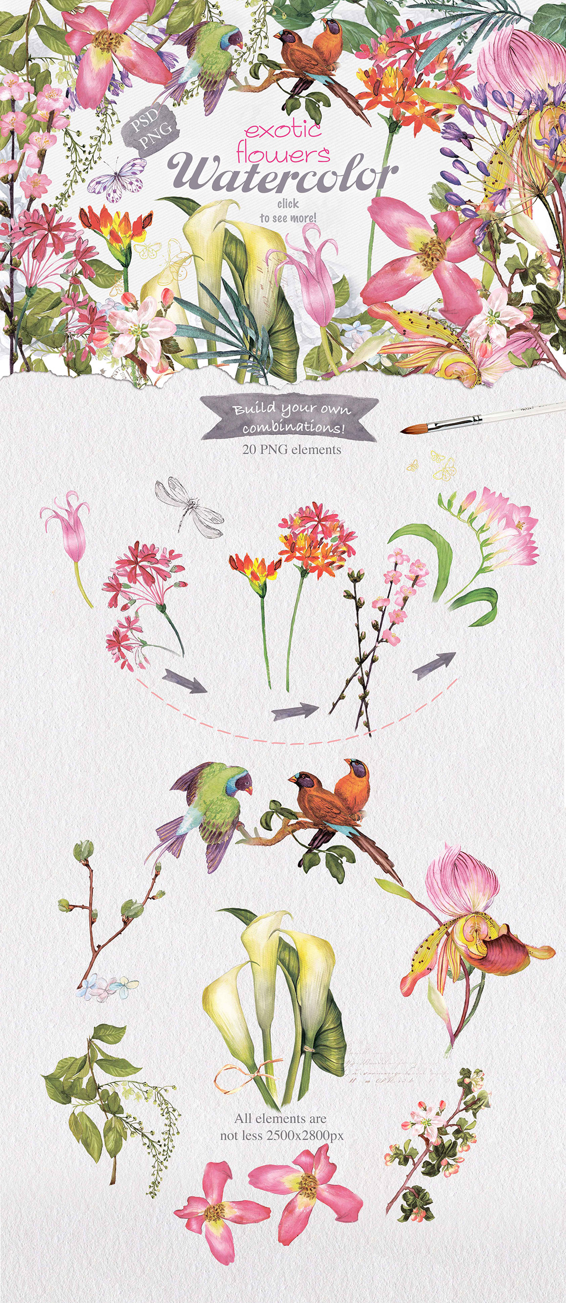 This is a big watercolor collection containing over 120 graphic elements, include flowers,floral wreathes, floral bouquets, leaves ,branches, watercolor background,birds. Here is amazing watercolor macro exotic flowers – lily, lotus, calla flowers and other / big size/. All of this items can be used for various purposes, such as logos, wedding invitation, label,greetings, packaging, stationery, posters, websites, digital presentations and more….you can DIY anything you want!