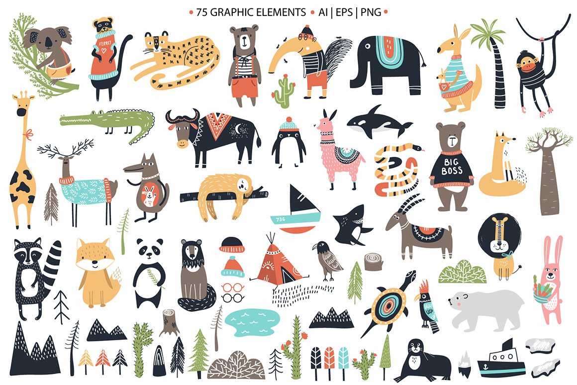 Need some cute, animals & kid style illustration set or pattern for your new web or print project? Whatever the case, this amazing illustration or artistic graphics bundle with lot of handdrawn illustrations, letterings, posters & patterns is great source for all print or branding designers…. These graphics are in vector & hi-res PNG format so all are great for your new web design or any print design projects. Enjoy 😉