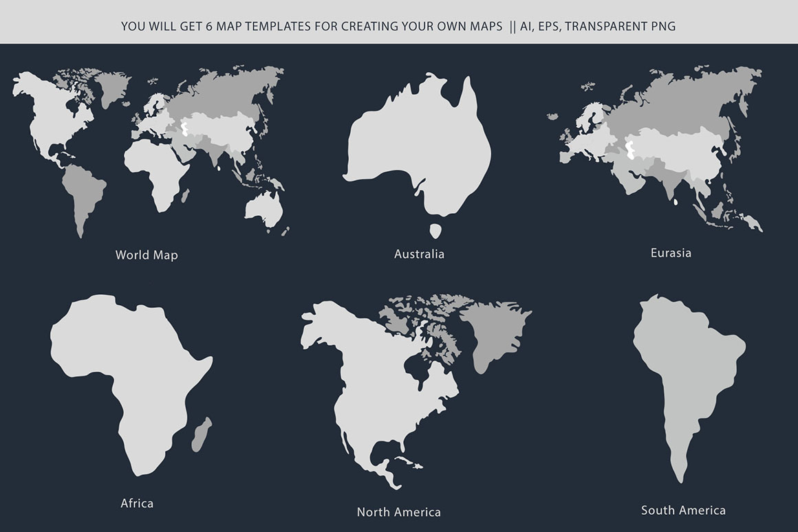 - 6 Continents Maps (AI, EPS 10, transparent PNG)