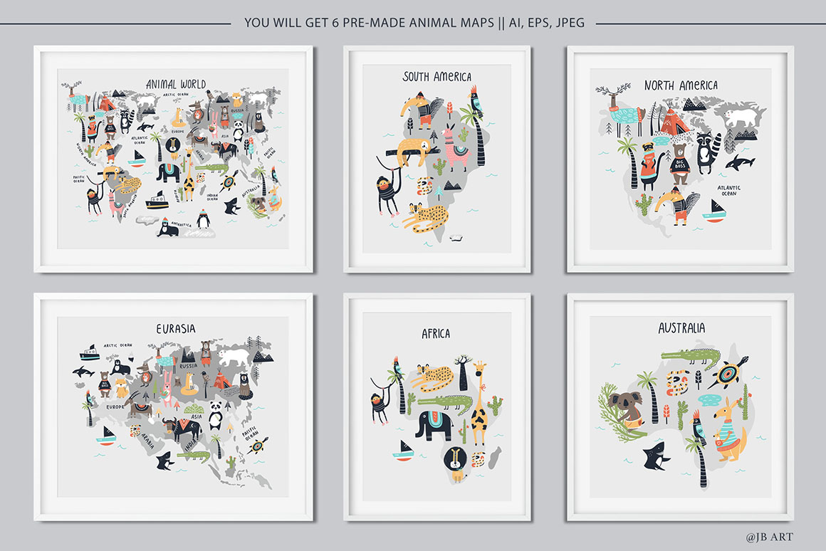 I am very glad to introduce you my new project “Animal World – Map Creator». In the package you will find 75 Clip Art elements, 25 lettering phrases and words, 6 map template, 6 pre-made animal maps, 12 pre-made nursery posters. You can mix and match elements to create your own unique maps. Also, you can easily create nursery posters and baby outfit design.