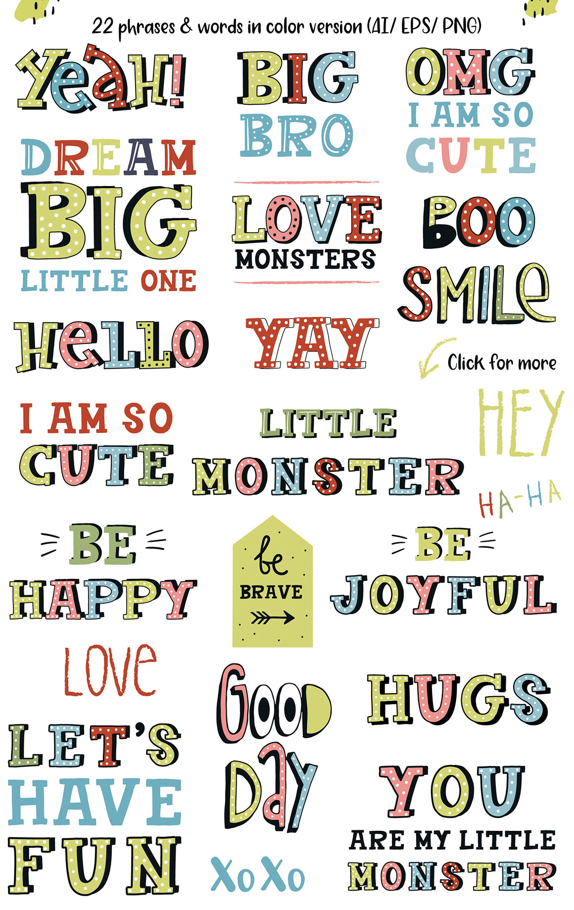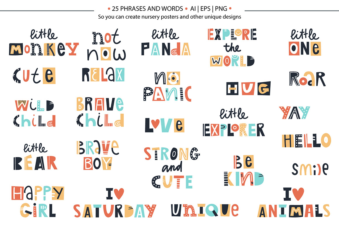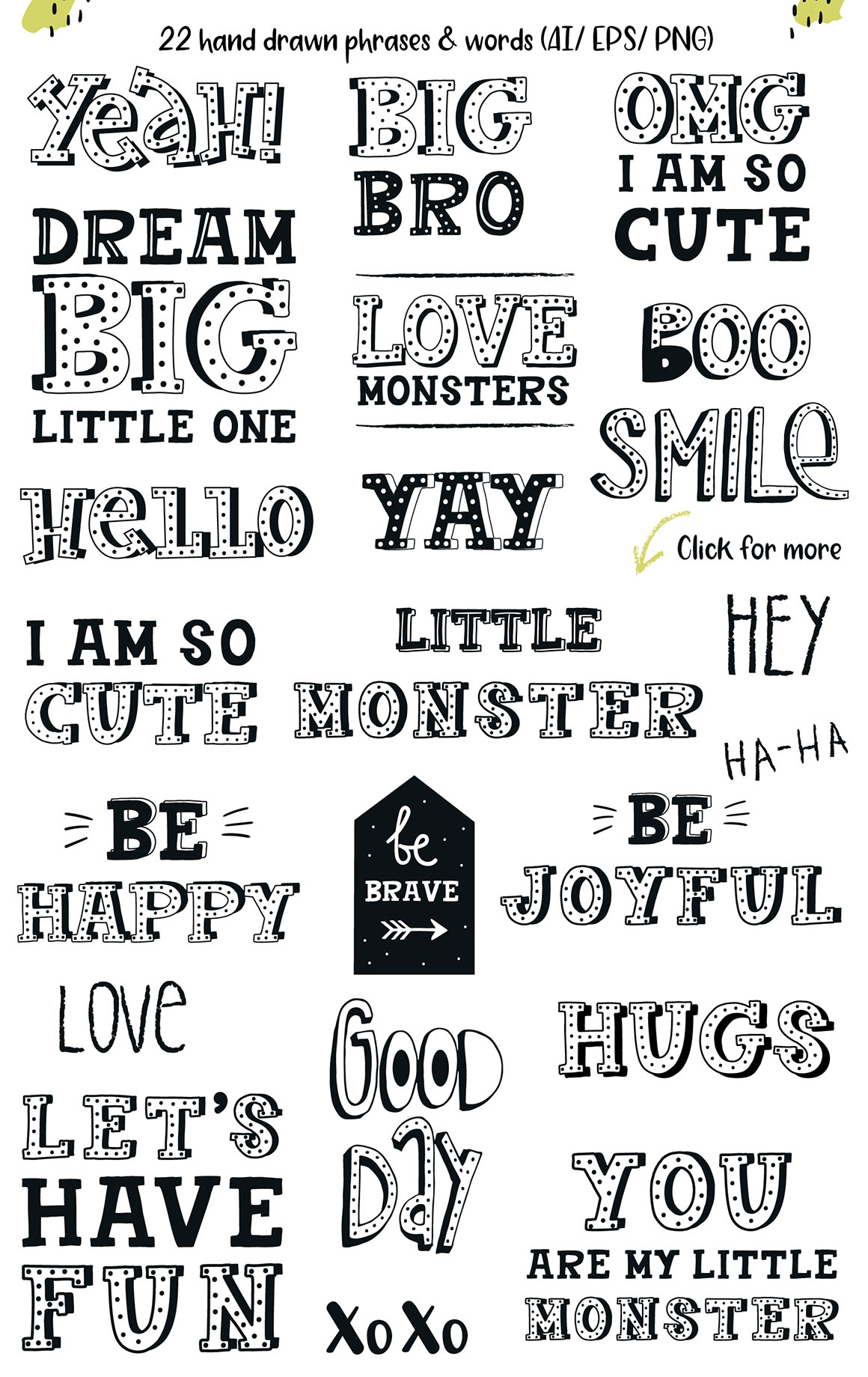 This collection includes 20 characters, 52 elements, 22 black and white hand drawn phrases and words, 22 color hand drawn phrases, 9 seamless patterns, 16 pre-made posters, ABC in 2 variations (each letter on PNG transparent background). It’s perfect for wall design, posters, room decor and children prints.