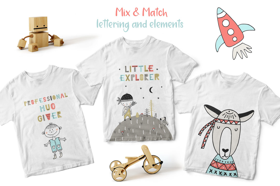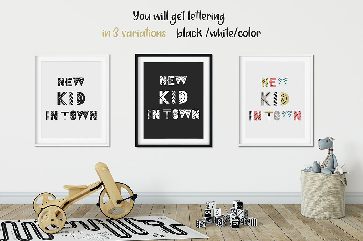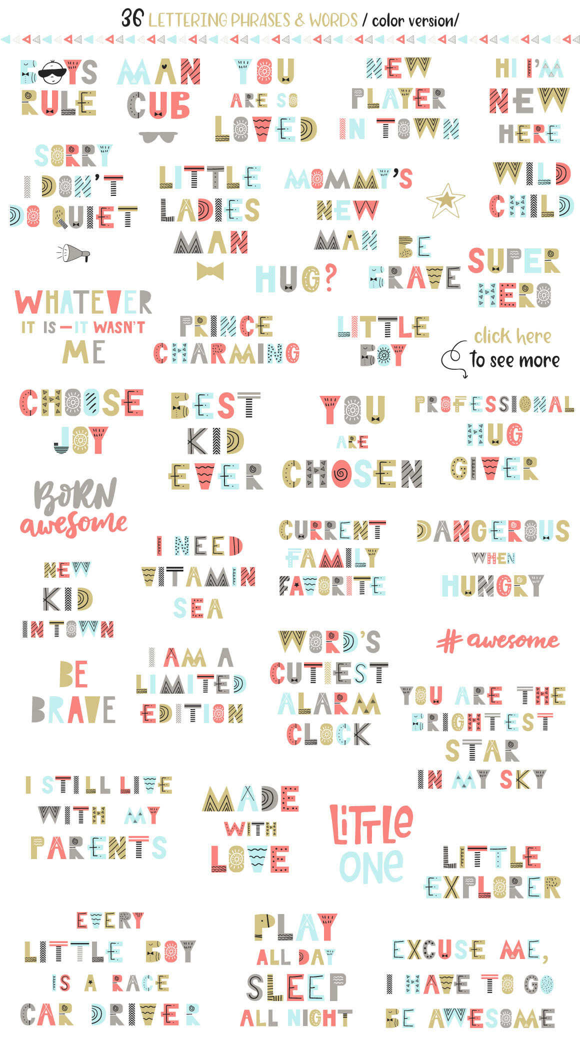This collection includes 20 characters, 52 elements, 22 black and white hand drawn phrases and words, 22 color hand drawn phrases, 9 seamless patterns, 16 pre-made posters, ABC in 2 variations (each letter on PNG transparent background). It’s perfect for wall design, posters, room decor and children prints.