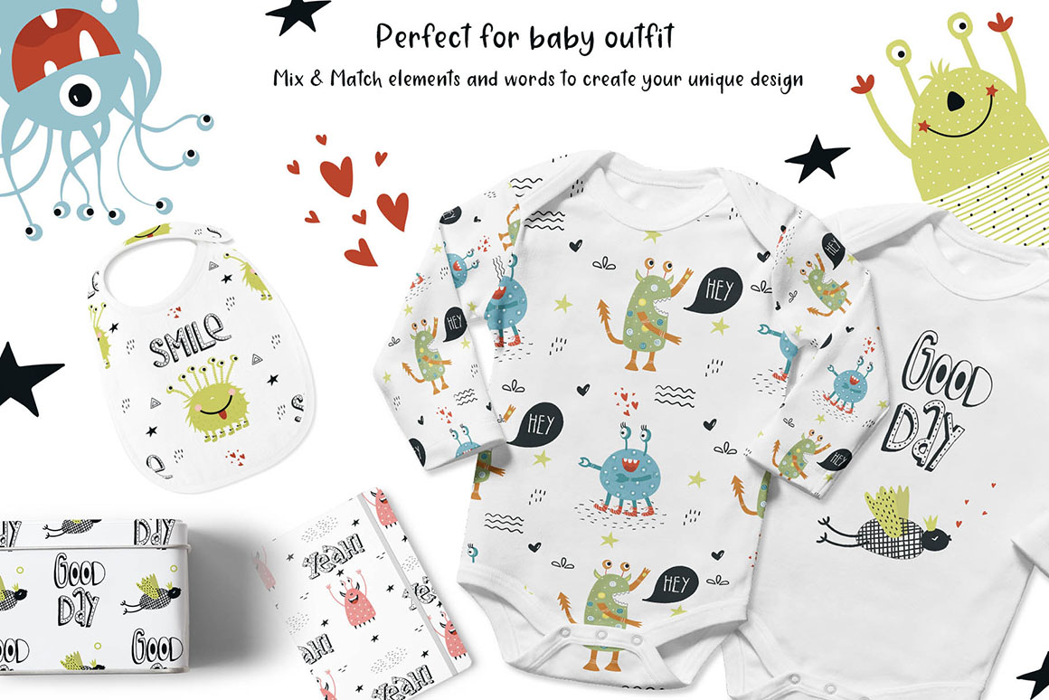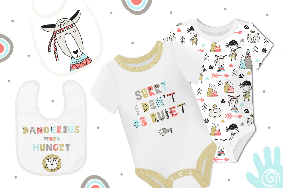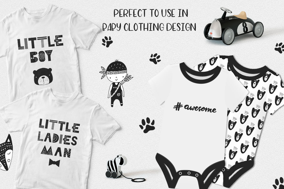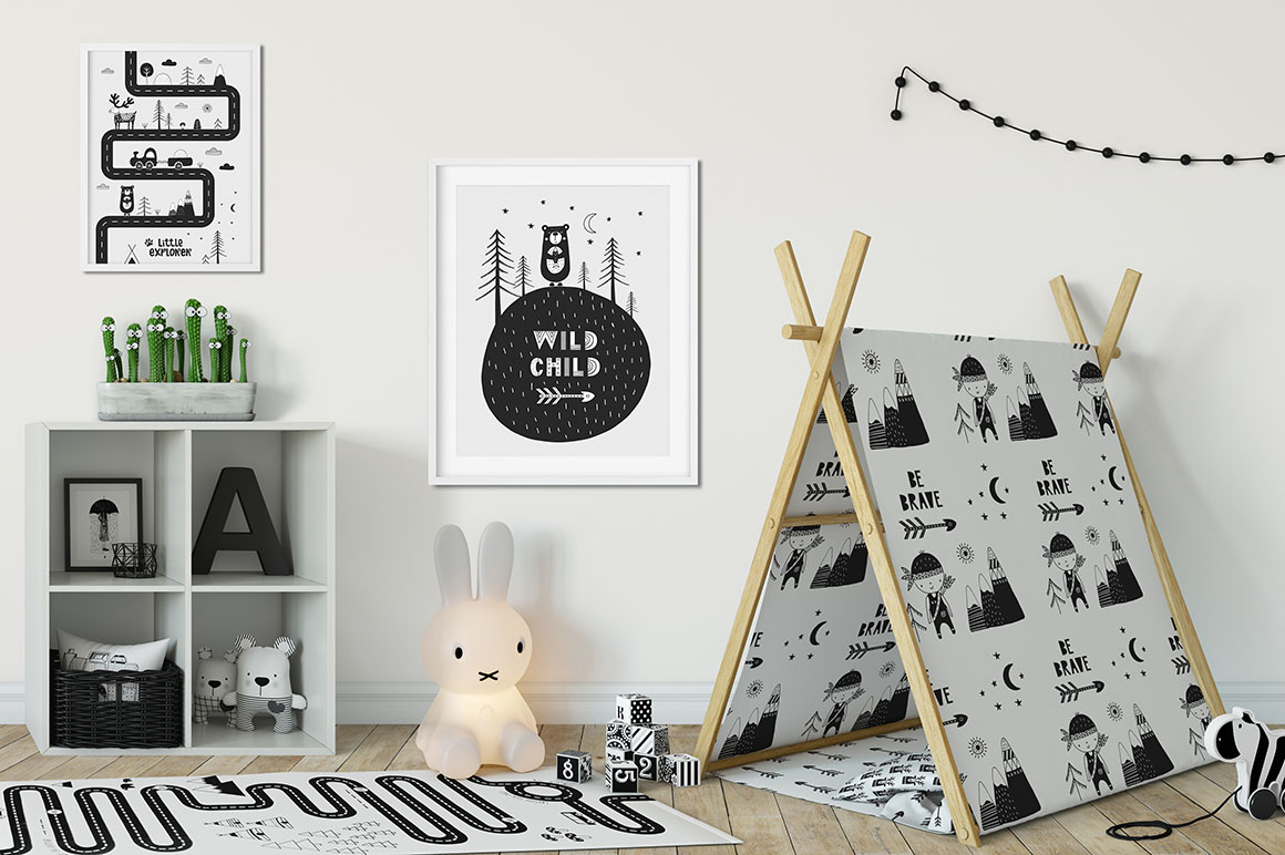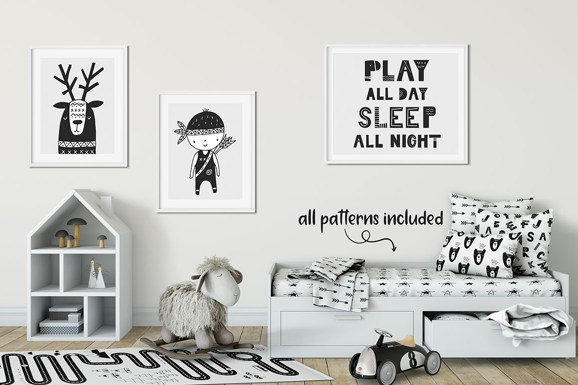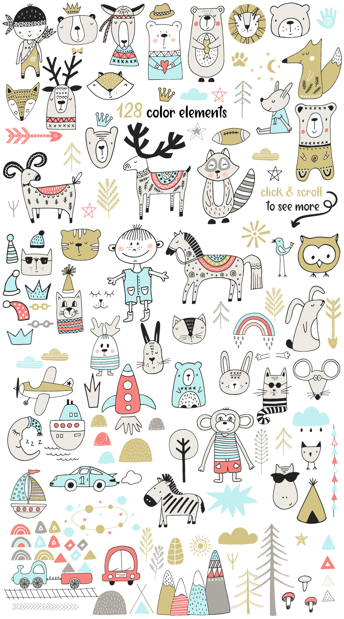 This nursery collection includes 115 black & white elements, 128 color elements, 36 lettering phrases & words (in black/white/color versions), 15 seamless patterns, 21 pre-made monochromes and color posters, ABC (each letter on PNG transparent background in black & white versions). All elements of the collection were drawn by hand and then carefully digitzed. It’s perfect for wall design, posters, room decor and children prints.