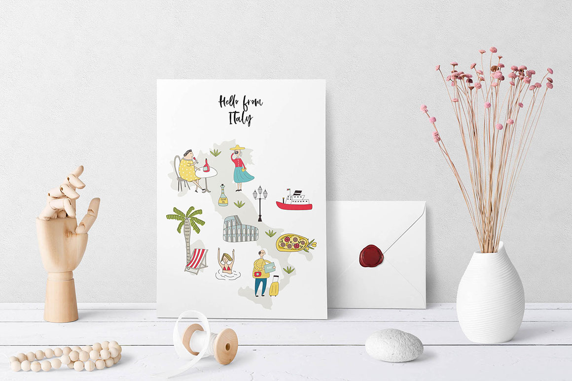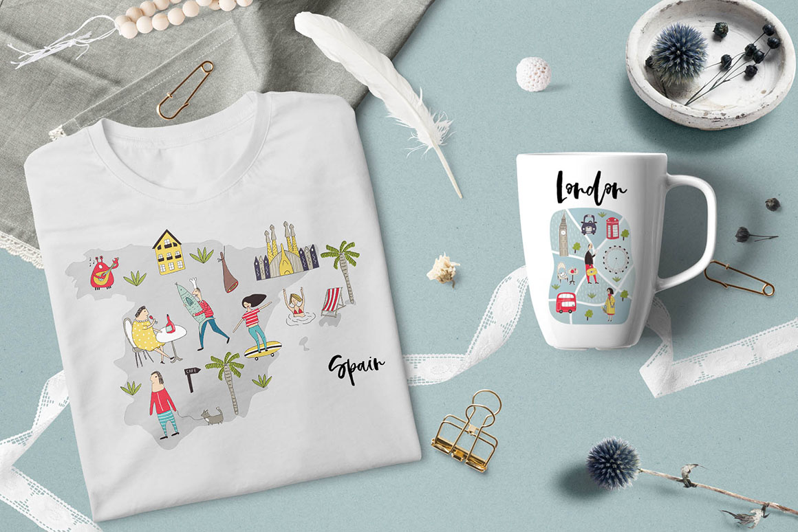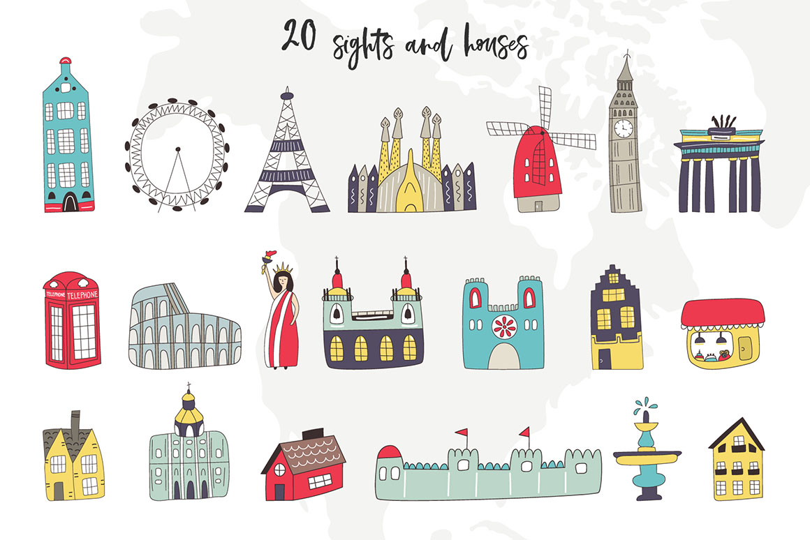 I am happy to introduce you Map Creator. In the package you will find 15 maps – maps of 6 continents, a map of the world, a map of Europe and maps of 8 European countries. I also created 107 cute characters, sights, outdoor items, transport items and food. You can mix and match the elements to create your own unique maps of your favorite destinations. Also, you can easily create posters of your favorite cities from 8 abstract templates. Also, I made for you pre-made maps of continents, countries and cities.