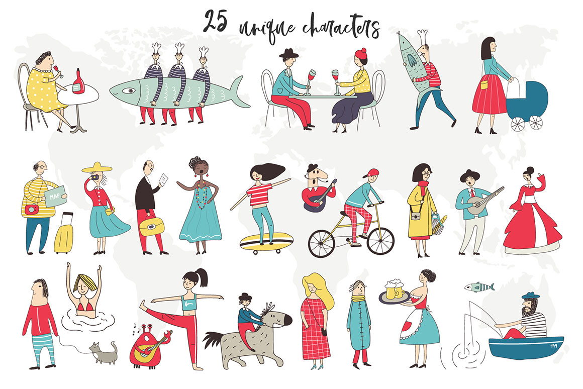 - 25 unique and fun characters – (AI, EPS 10, transparent PNG)
