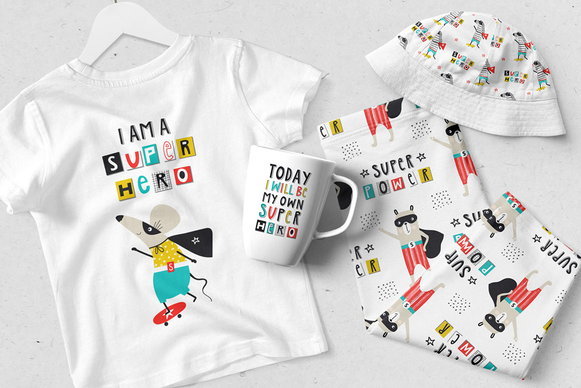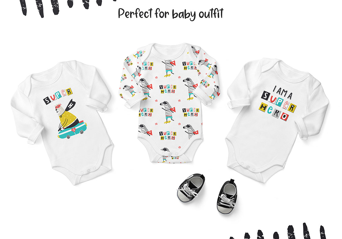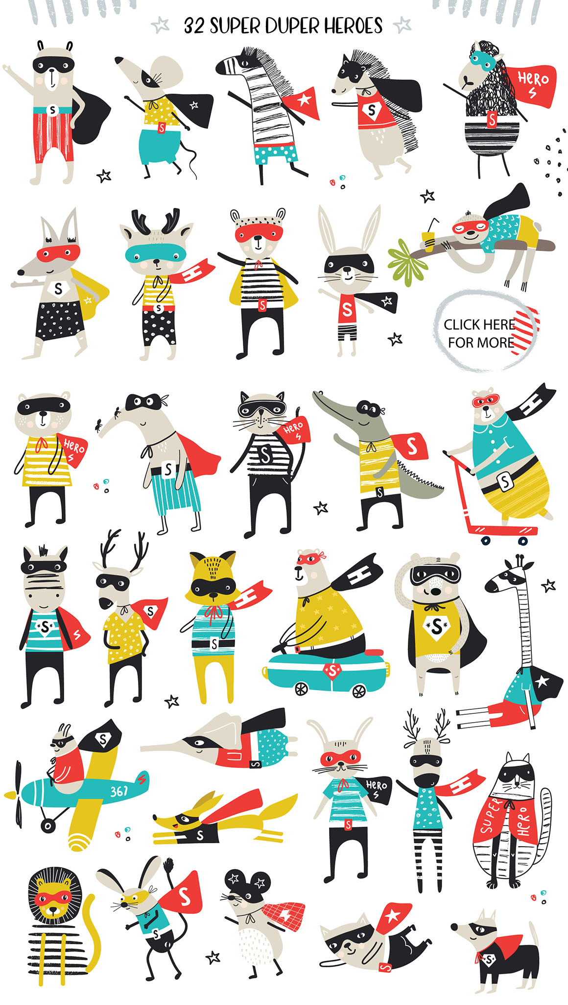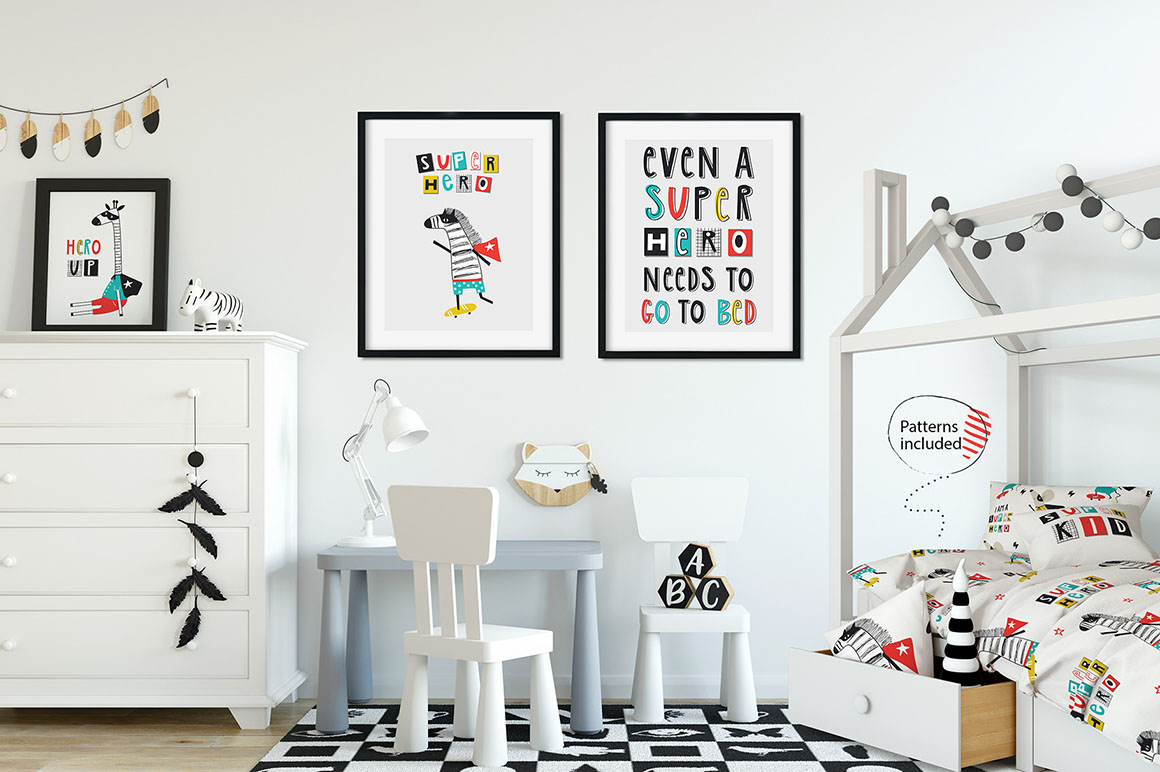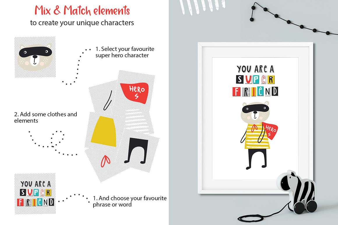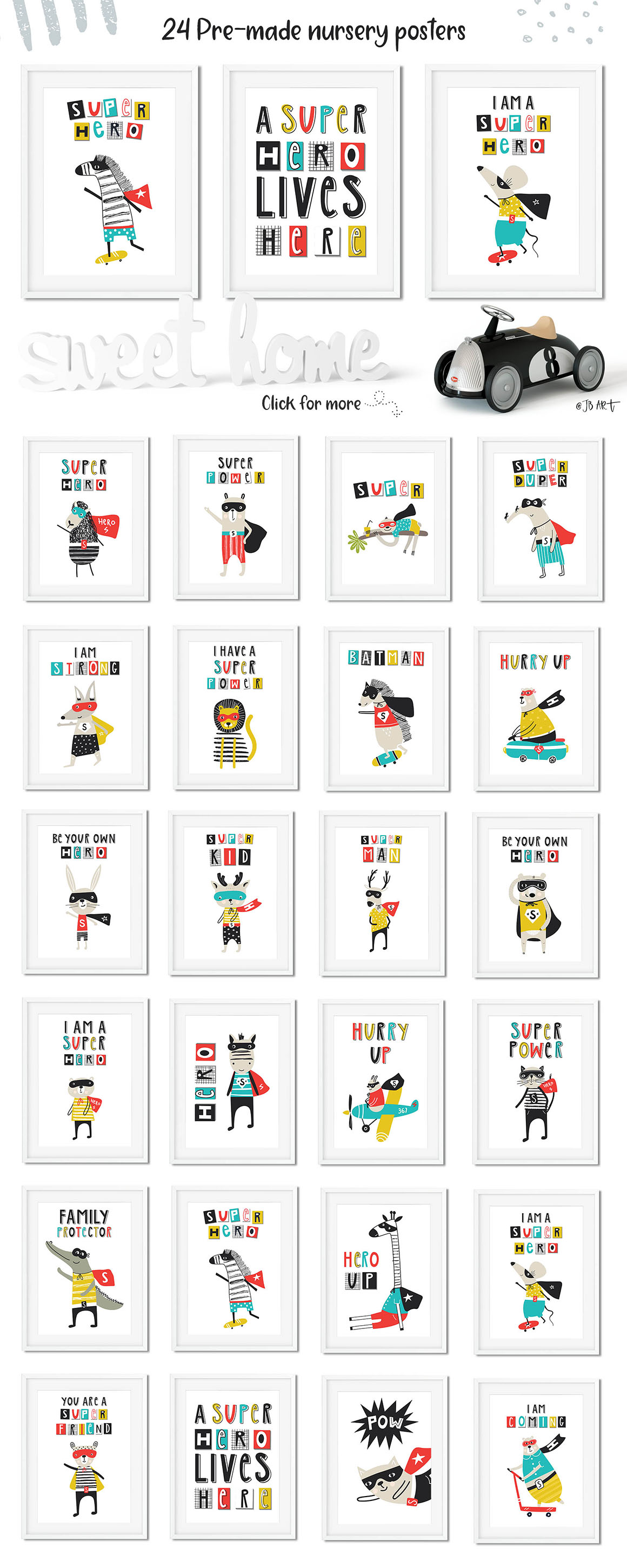This nursery collection includes 32 super hero animals, 12 cute animal faces, 80 outfit and decor elements, 36 lettering phrases and words, 24 pre-made nursery posters, 3 patterns, 26 latin ABC letters (each letter on PNG transparent background).