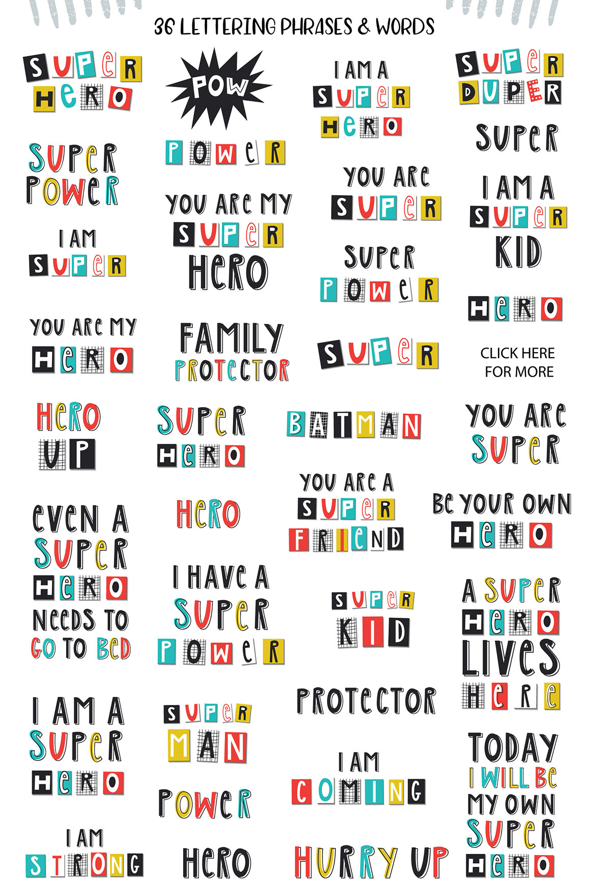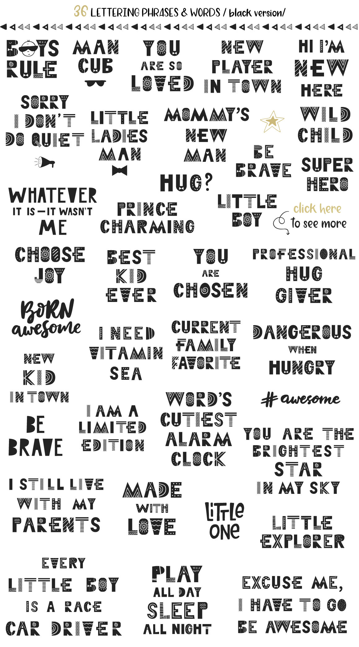 - 36 lettering phrases & words in black/white/color versions (AI, EPS 10, transparent PNG)