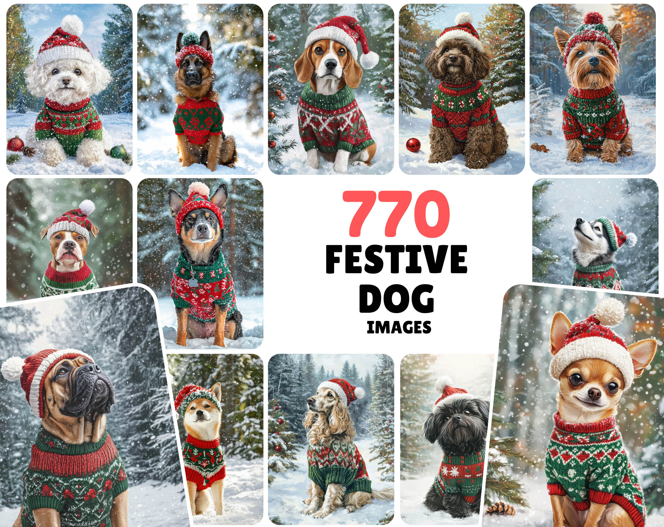 • 770 Dog Images on Snow with Holiday Sweaters – cozy, festive visuals for holiday-themed work.