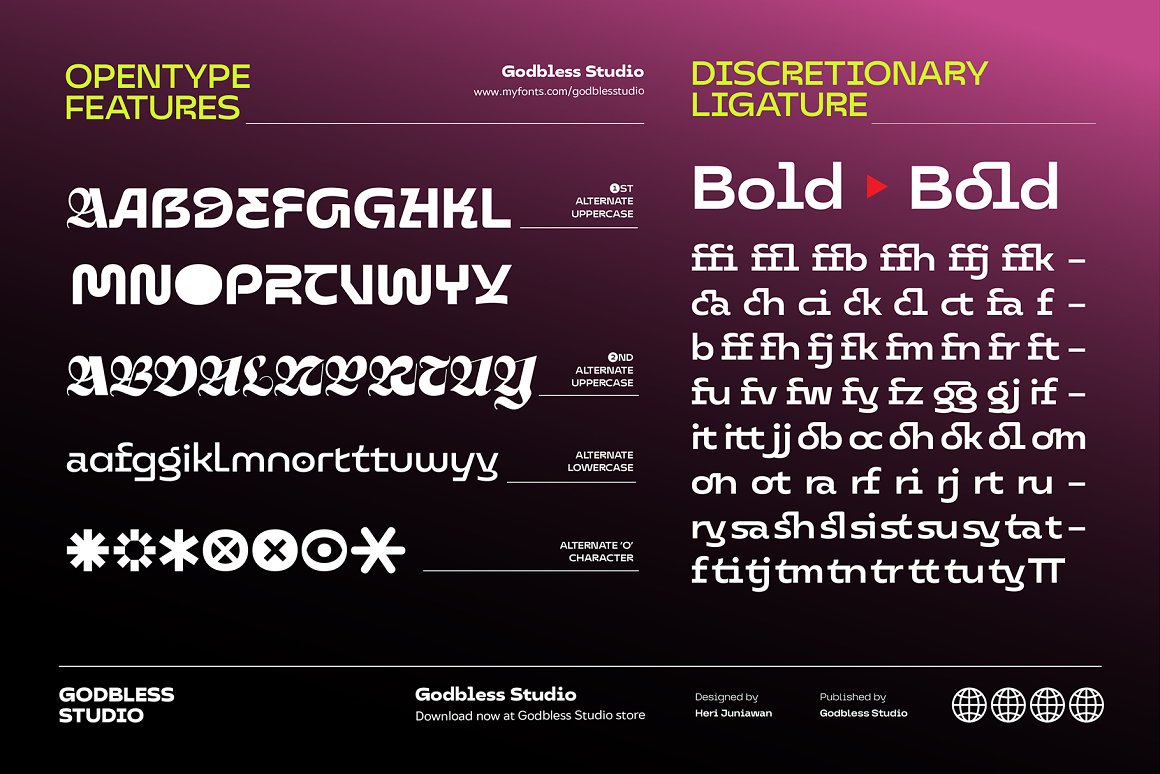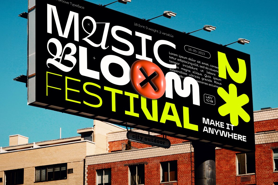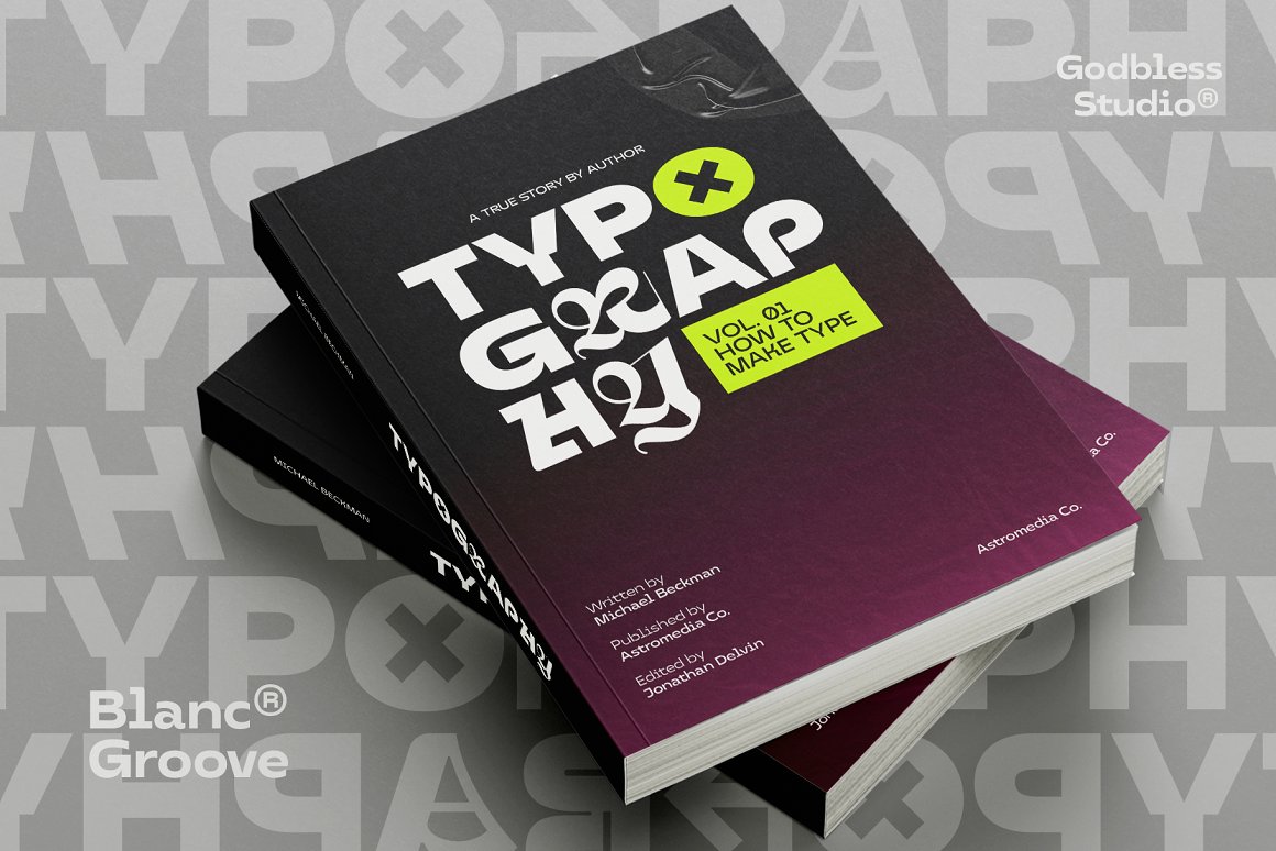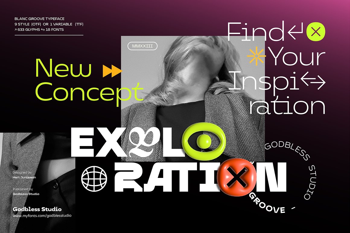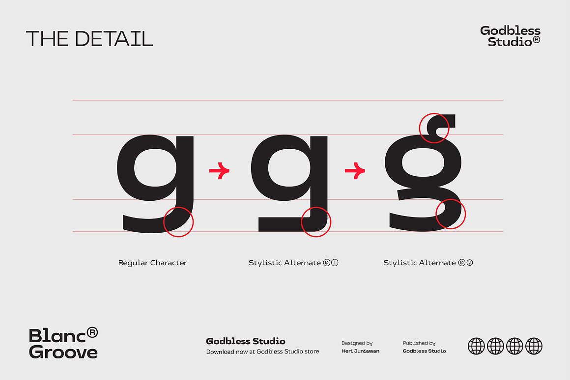 BLANC GROOVE, a font with a futuristic and experimental concept created with a strong and charismatic character. following the current trend design style. BLANC GROOVE is made experimentally following a futuristic style recipe with alternate characters made with outstanding alternate and display that makes this font more stylish and varied. BLANC GROOVE is a variable font that has 18 Font, 9 weights with 2 Variable from thin to black & Italic. also includes alternates that are more varied with variables. BLANC GROOVE is a versatile font system, designed primarily for display uses with a need of visual impact.
