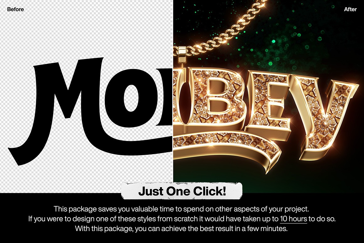 Introducing a meticulously crafted collection showcasing the exquisite Bling Bling style of design. With a simple click, you can effortlessly transform your plain text, logo, or shapes into masterpieces. This comprehensive set of styles is meticulously designed to save you hours of work and effort. By entering your text / logo onto the sheet and saving the file, you can quickly achieve stunning results. The flexibility of this package allows for easy customization as all layers are open for modification. Whether you prefer a background or a transparent style, exporting your design is a breeze. Each style in this collection has been meticulously created with uncompromising quality, dedicating over 10 hours to perfecting each one. With a total of 10 unique styles, this package required over 100 hours of meticulous preparation. As a result, you can effortlessly implement your desired style in 5 minutes or less.