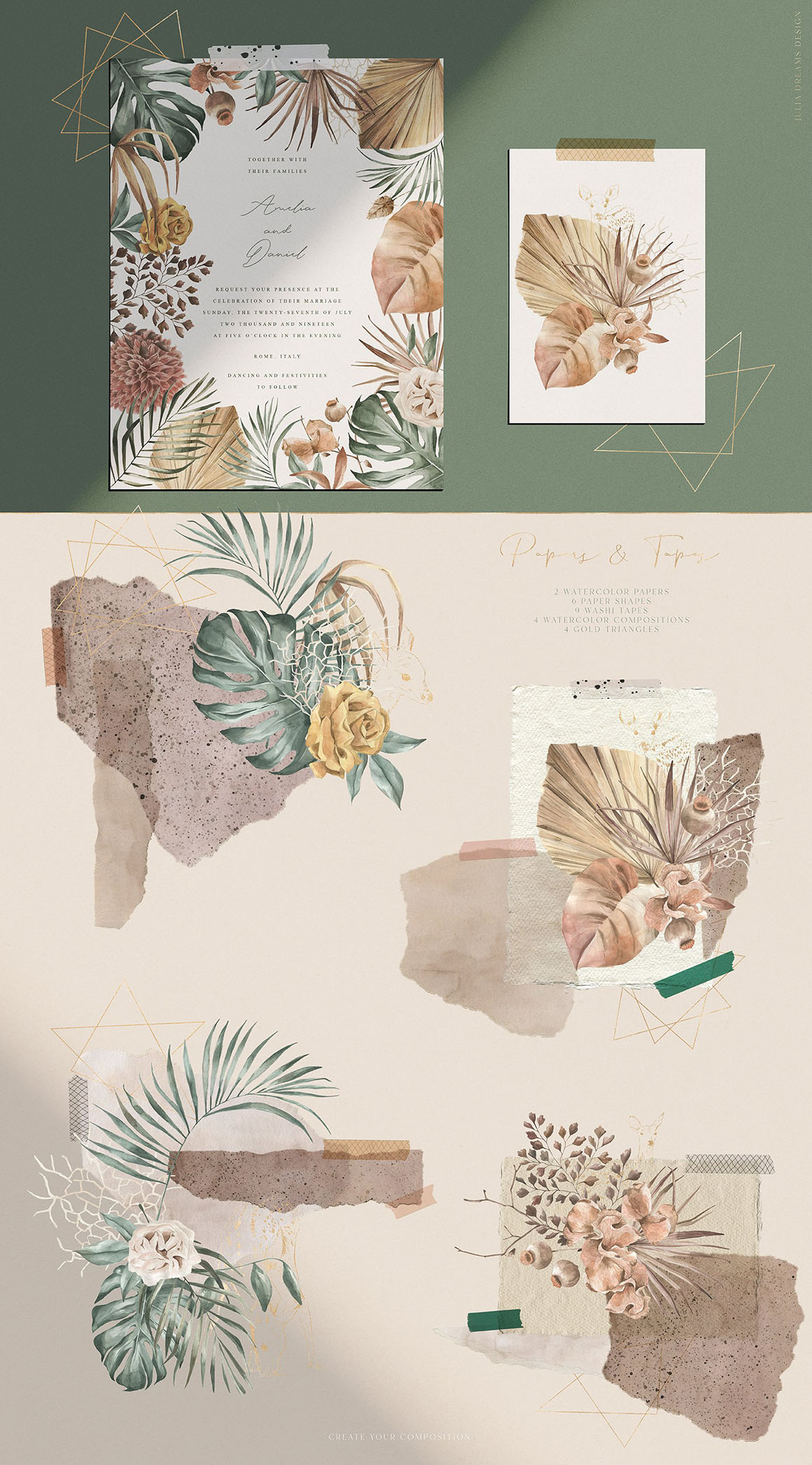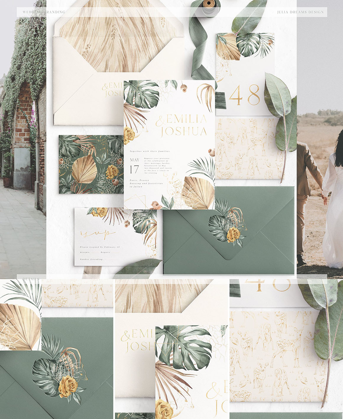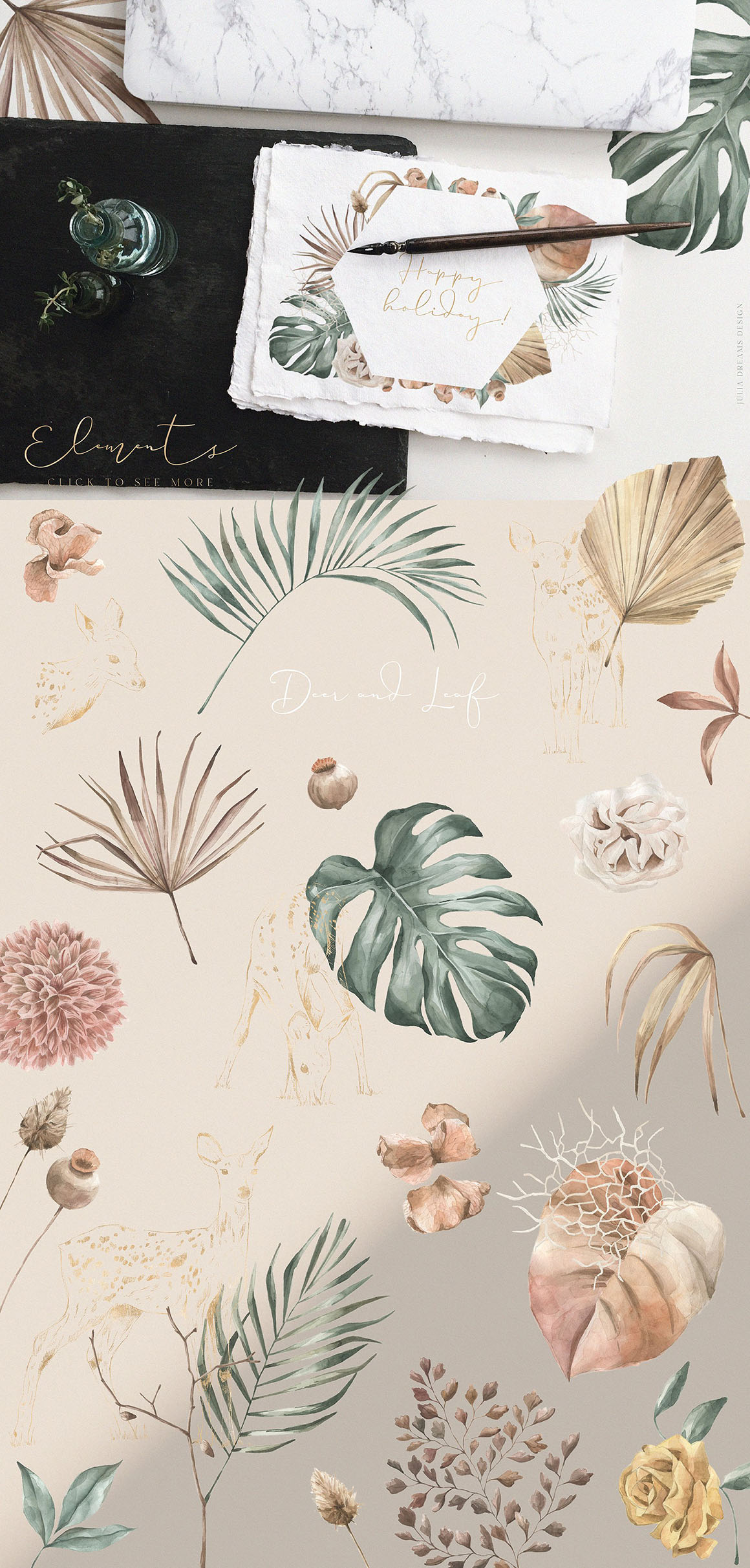 A delicate palm leaf and a small golden deer create an absolutely emotional atmosphere of the collection. Hand painted with love watercolor botanical elements can perfectly complement your project and help create a sophisticated, restrained and fashionable style. All these elements can make a special atmosphere in your project: from wedding to stationery branding, from fabric for dresses to posters and postcards. This collection was carefully crafted and great attention was paid to details. It consists of different flowers, patterns and decorative elements that can be used individually or combined with other elements. Use ready-to-use patterns and compositions, or create your own individual composition using all these elements.