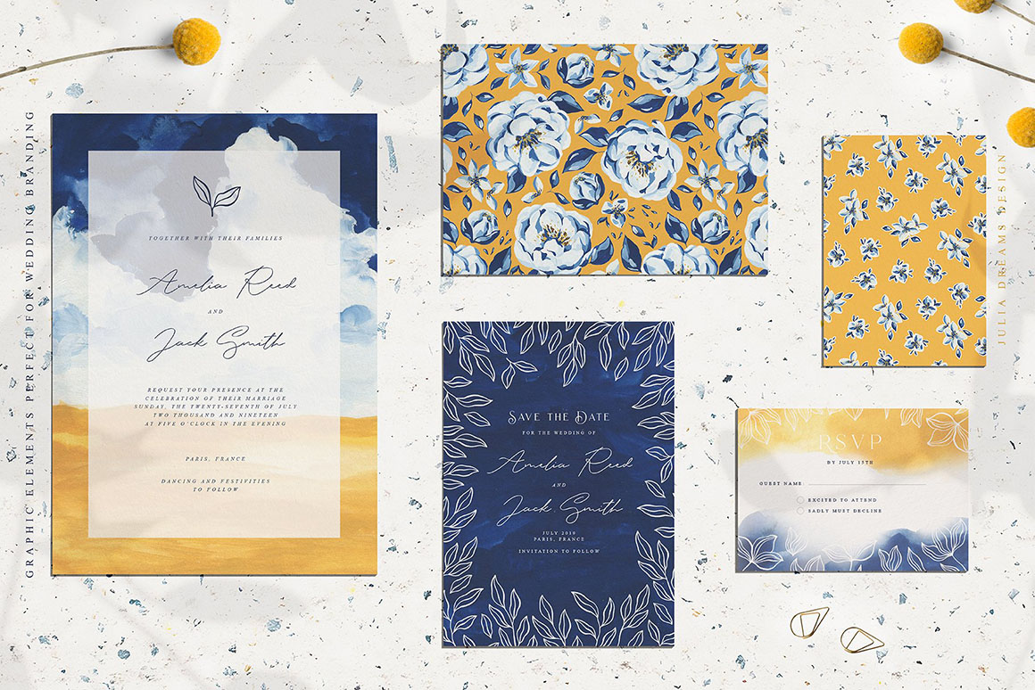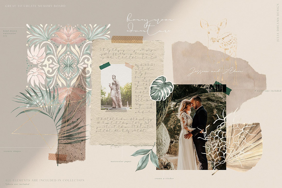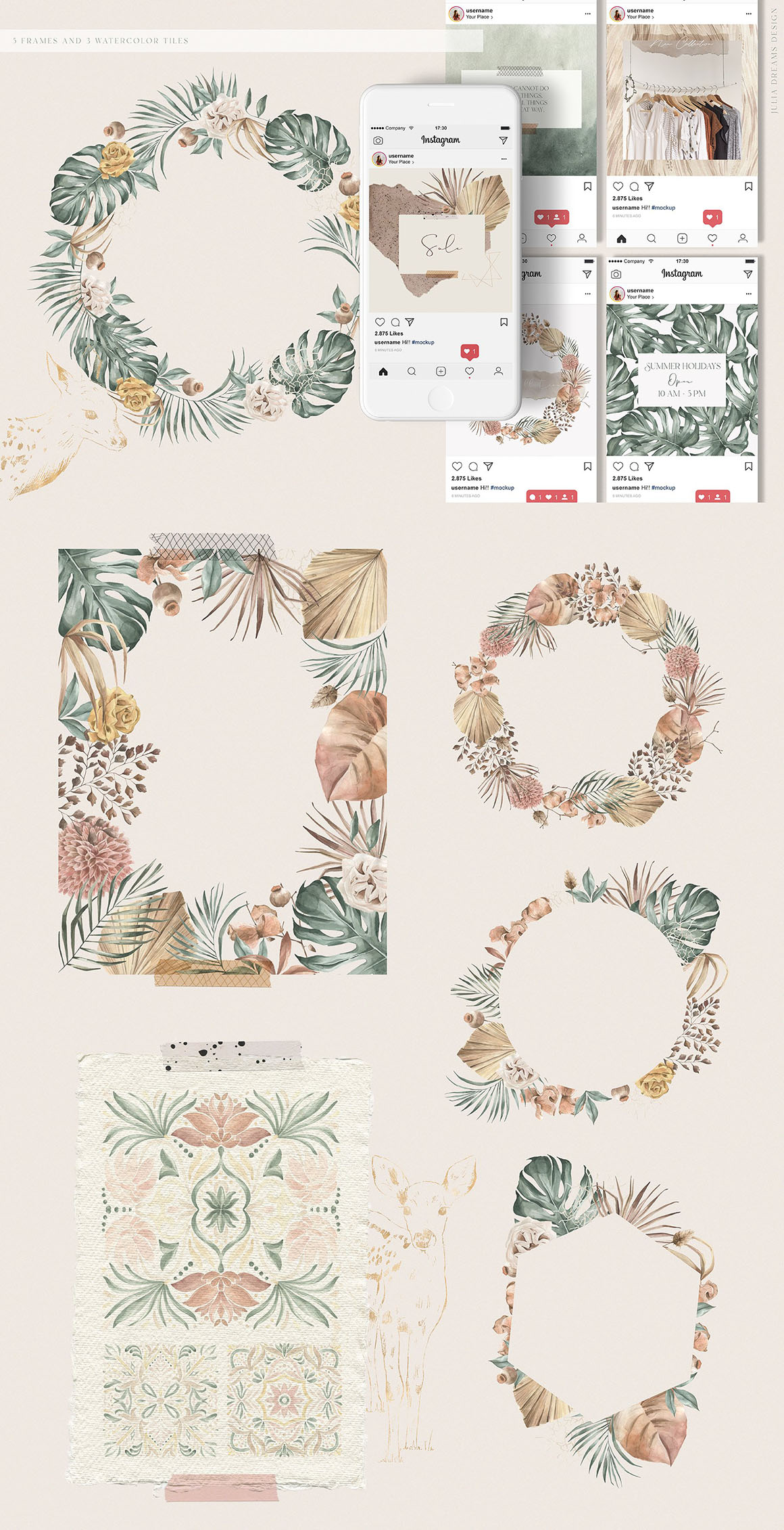 A delicate palm leaf and a small golden deer create an absolutely emotional atmosphere of the collection. Hand painted with love watercolor botanical elements can perfectly complement your project and help create a sophisticated, restrained and fashionable style. All these elements can make a special atmosphere in your project: from wedding to stationery branding, from fabric for dresses to posters and postcards. This collection was carefully crafted and great attention was paid to details. It consists of different flowers, patterns and decorative elements that can be used individually or combined with other elements. Use ready-to-use patterns and compositions, or create your own individual composition using all these elements.