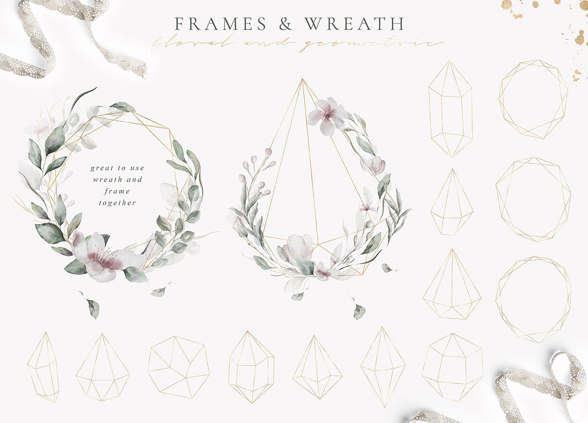 Greenery and Blush, Gentle and Soft, Botanical and Geometrical – all these elements are the atmosphere of this beautiful collection. Hand painted with love elements can perfectly complement your project and help create a sophisticated, restrained and fashionable style. All these elements can make a special atmosphere in your project: from wedding to stationery branding, from logo to posters and postcards. This collection was carefully crafted and great attention was paid to details. It consists of different floral elements, botanical frames, flowers, patterns that can be used individually or combined with other elements.