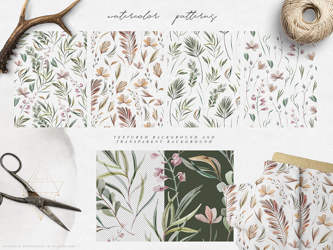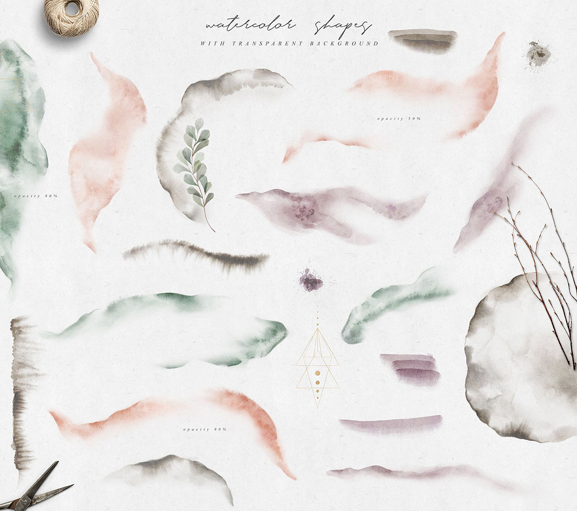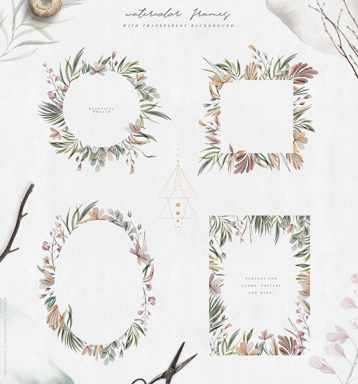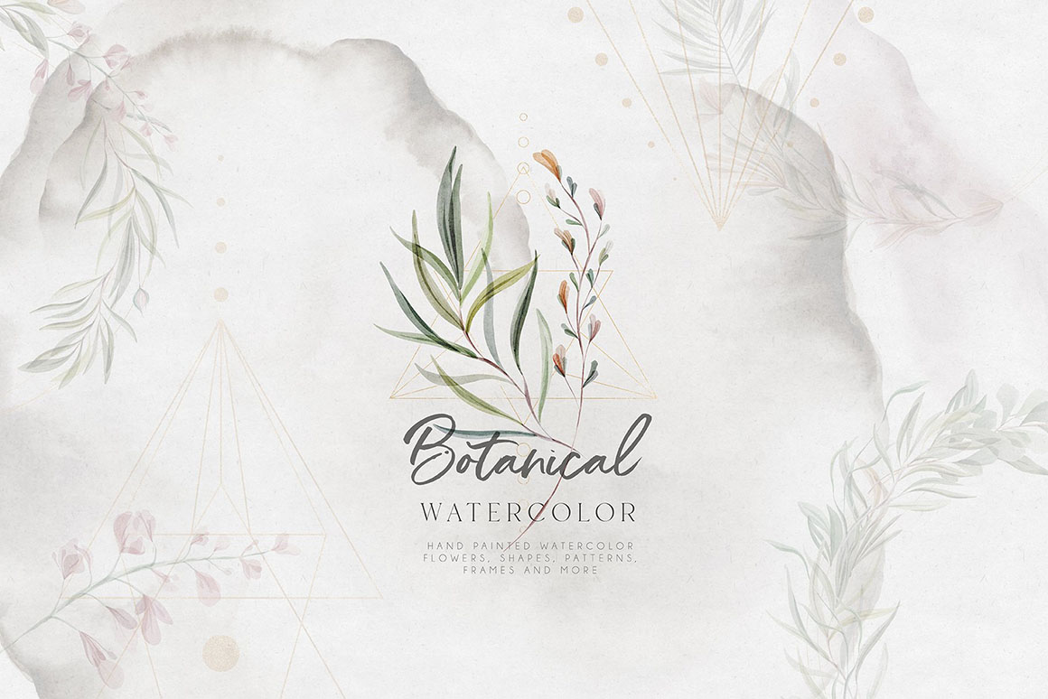 Watercolor Botanical Collection. Hand painted with love watercolor elements can perfectly complement your project and help create a sophisticated, restrained and fashionable style. All these elements can make a special atmosphere in your project: from wedding to stationery branding, from fabric for dresses to posters and postcards. This collection was carefully crafted and great attention was paid to details. It consists of different floral elements, patterns and triangles, watercolor shapes that can be used individually or combined with other elements. Use ready-to-use patterns and mandala elements or create your own individual composition using all these elements.