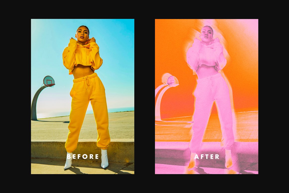 Believe your eyes when you look at this blurred photo effect — it’s not possessed, there’s no spooky phantom, we promise! Instead, the asset was blessed with editing options, making it a powerful, versatile tool for recreating a motion blur with visions spinning all-around in a long exposure. It could be the simplest photo effect of apparent streaking of objects, but there’s more grain noise distortion to it than you imagine at first. Flashes of image reappear as transparent blazes, following the main outlines and edges. With extra color filters, you can change the mood of an image with a single click. Charged with the futuristic and retro mood at the same time, the crafted result will fit any kind of graphic design project — advertisements, social media posts, landing pages, newsletters, creative portfolios, and product presentations.
