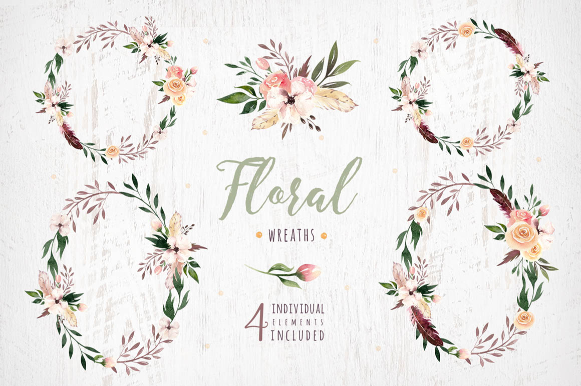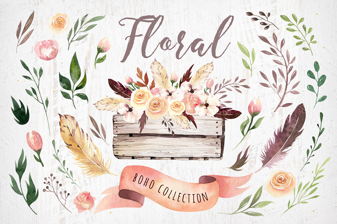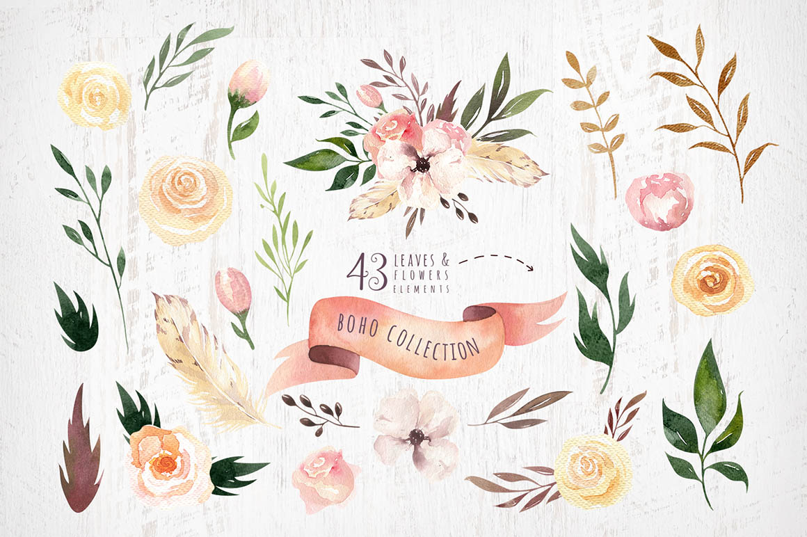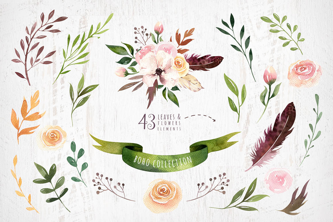 This set of high quality hand painted watercolor floral elements. Boho style. Perfect graphic for DIY, wedding invitations, greeting cards, quotes, blogs, posters and more.