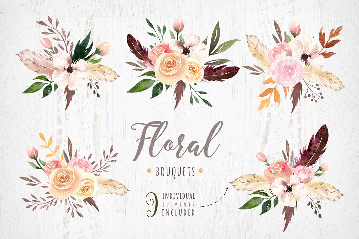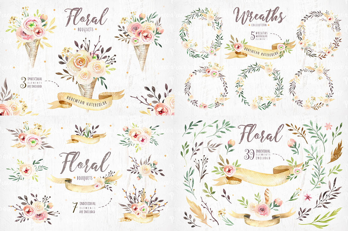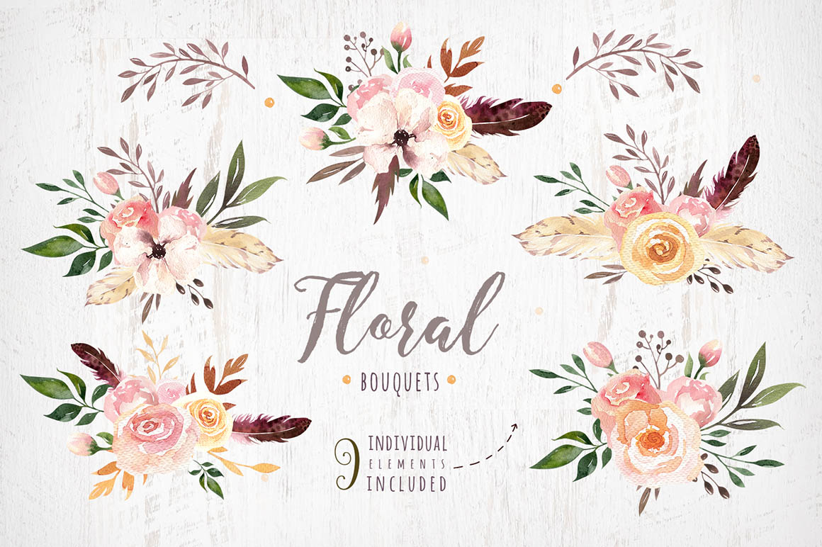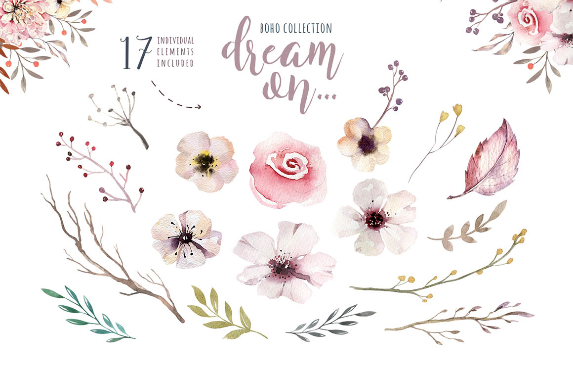 This set of high quality hand painted watercolor floral elements. Boho style. Perfect graphic for DIY, wedding invitations, greeting cards, quotes, blogs, posters and more.