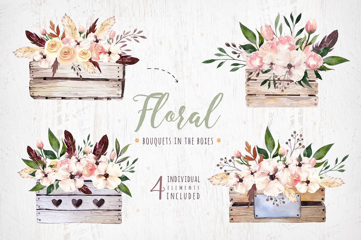 - 4 bouquets in a wooden boxes (300 dpi, PNG, transparent background)