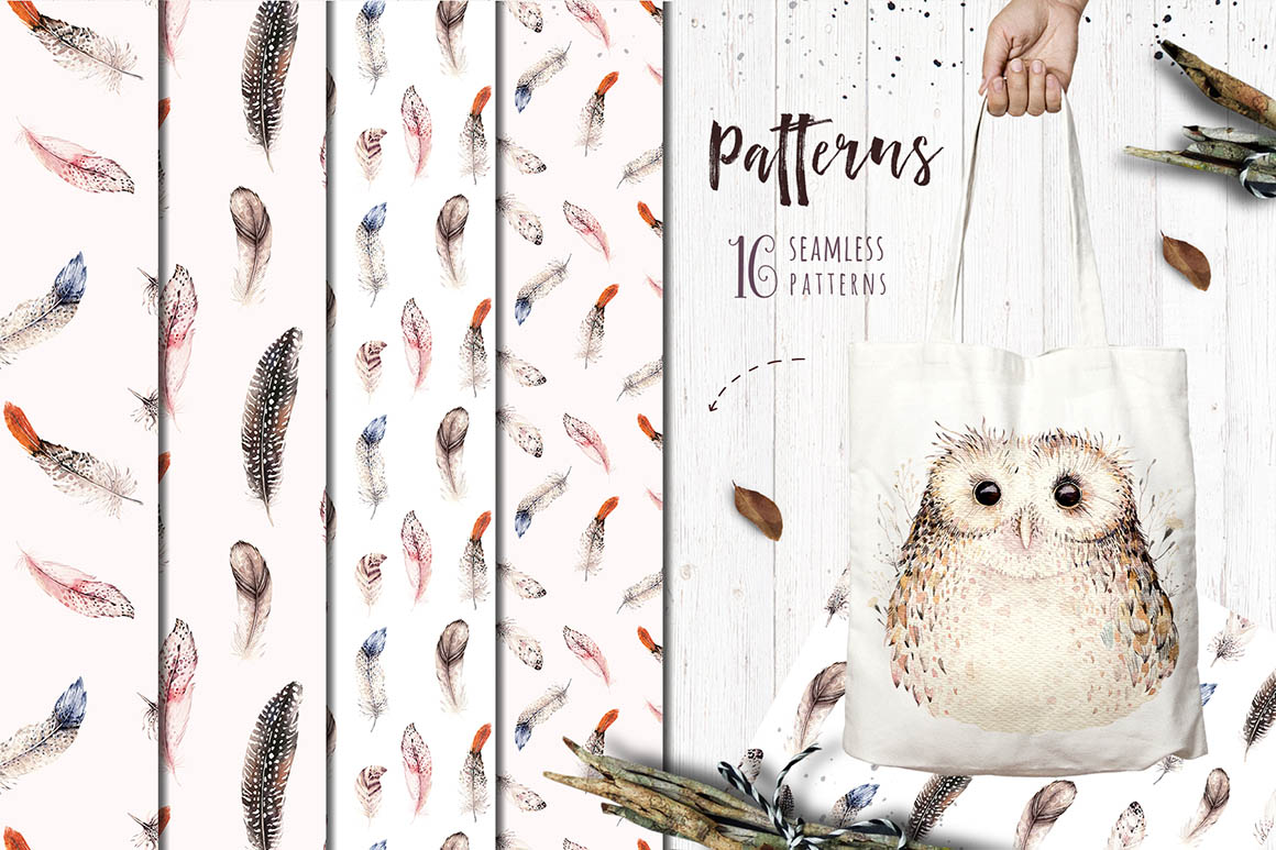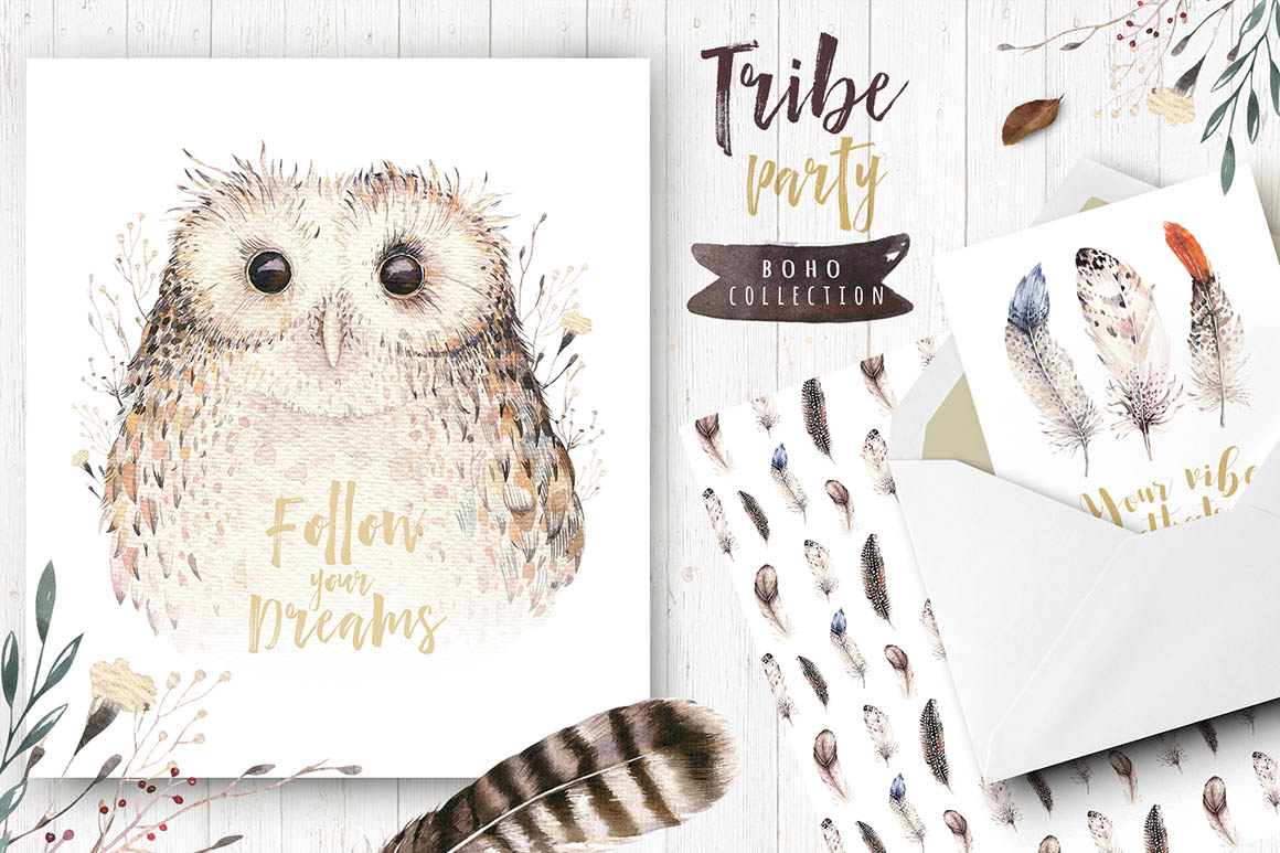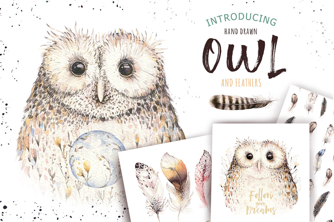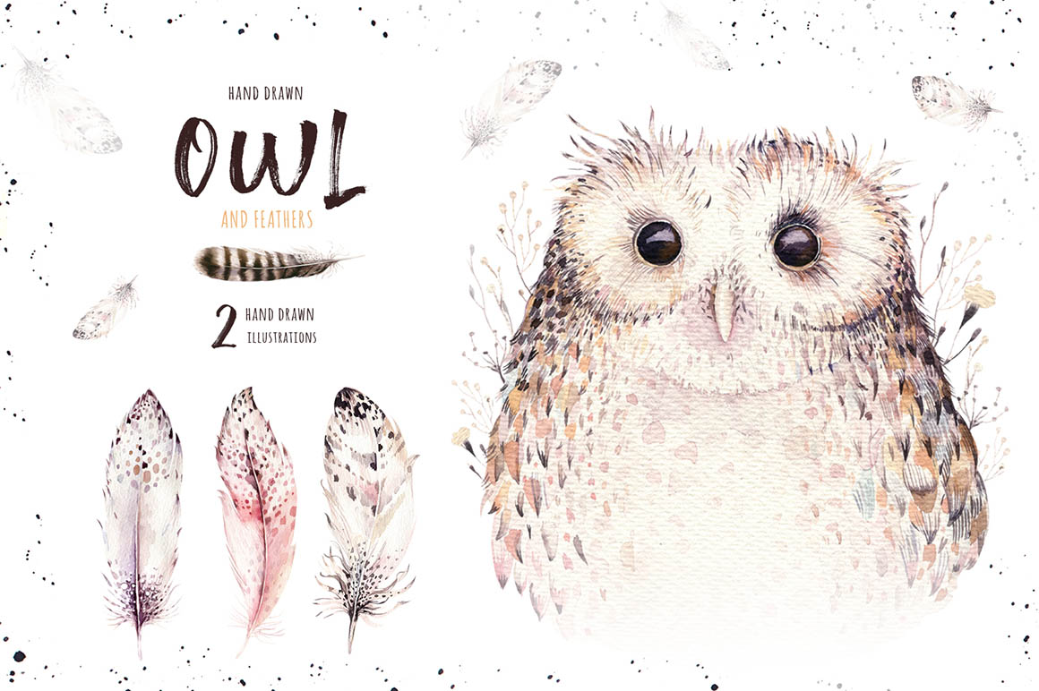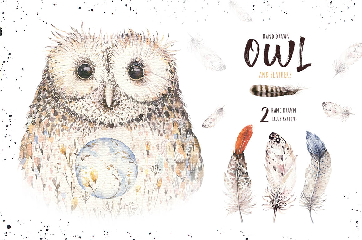 This set of high quality hand painted watercolor owls and feathers.Boho style. Perfect graphic for DIY, wedding invitations, greeting cards, quotes, blogs, posters and more.