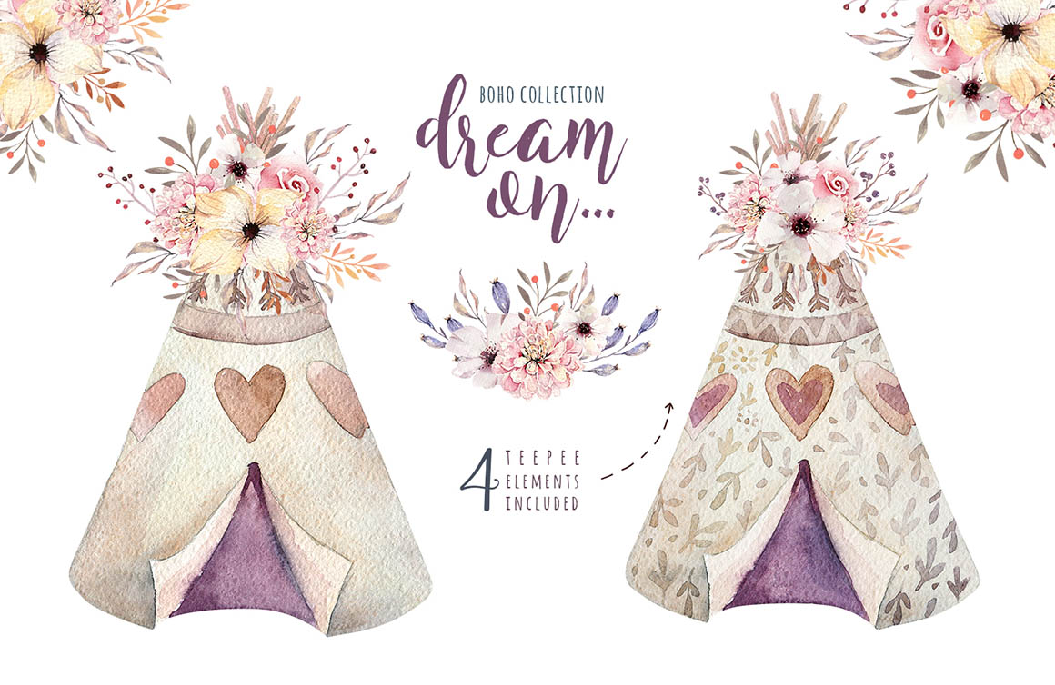 - 4 teepee images with floral elements ( PNG, 300dpi, transparent background)