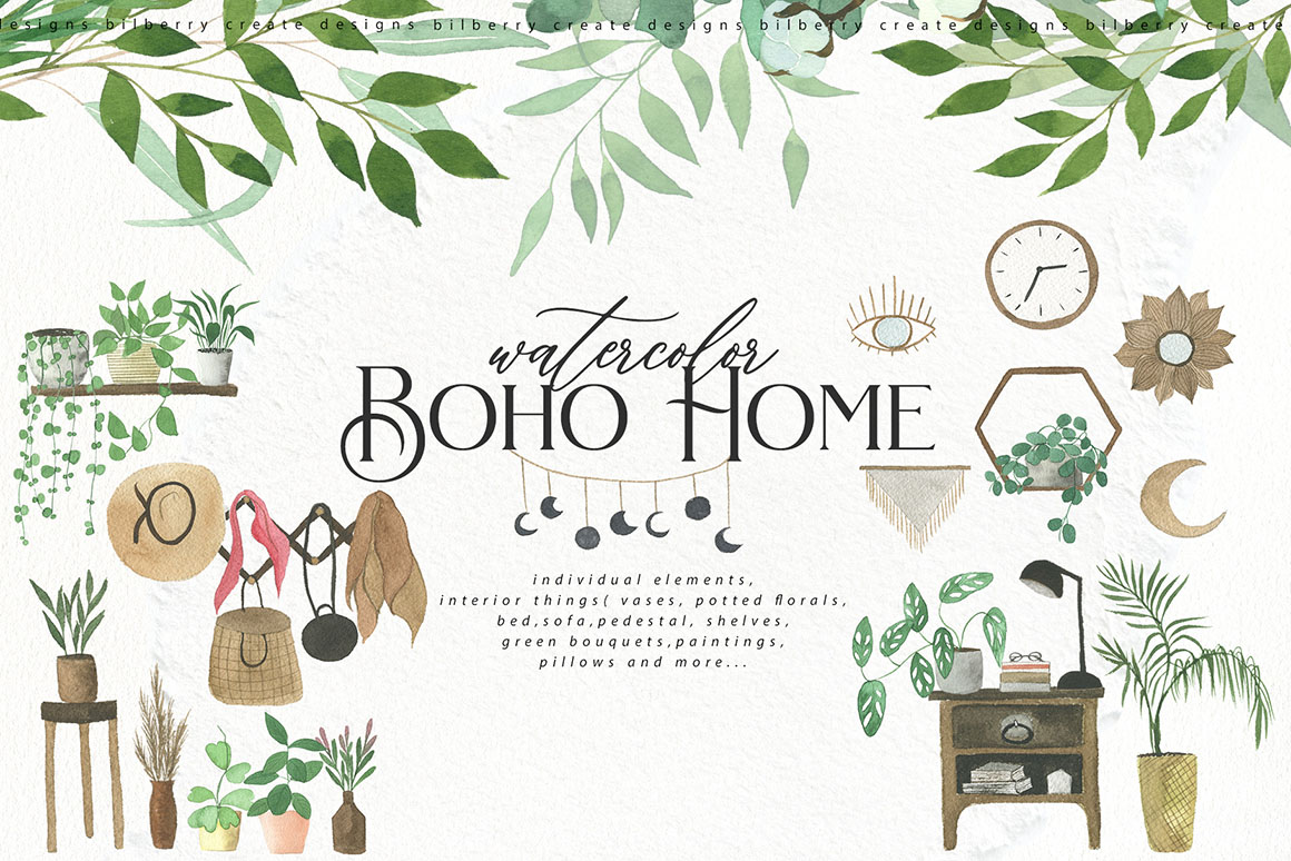 Watercolor Boho Home new design set contains individual elements, interior things, vases, potted florals, bed, sofa, shelves, green bouquets, paintings, pillows and more. Be sure to click on the image to see all elements. This product was created to help you make your digital images even more beautiful and unique. This pack can be used to create anything as you wish, logos invitation cards, make scrapbooking, wedding cards, birthday cards, home decor, packaging holiday gifts, party decorations, print on fabrics and so much more.