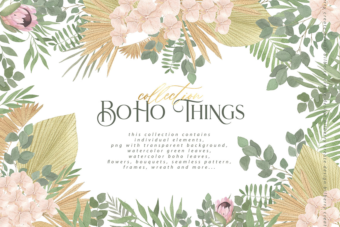 Boho Things NEW design set filled over 60 elements , individual elements, watercolour green leaves, watercolour boho leaves, palms leaves, watercolour flowers, seamless pattern, bouquets, frames, wreath and more. Be sure to click on the image to see all elements. This product was created to help you make your digital images even more beautiful and unique. This pack can be used to create anything as you wish, logos invitation cards, make scrapbooking, wedding cards, birthday cards, home decor, packaging holiday gifts, party decorations, print on fabrics and so much more. These elements are ideal for the creation of the corporate identity of your flowers shop or your small store. Or if you suddenly need to decorate your room or create a wedding invitation. Add this beautiful flowers and leaves to create a postcard.