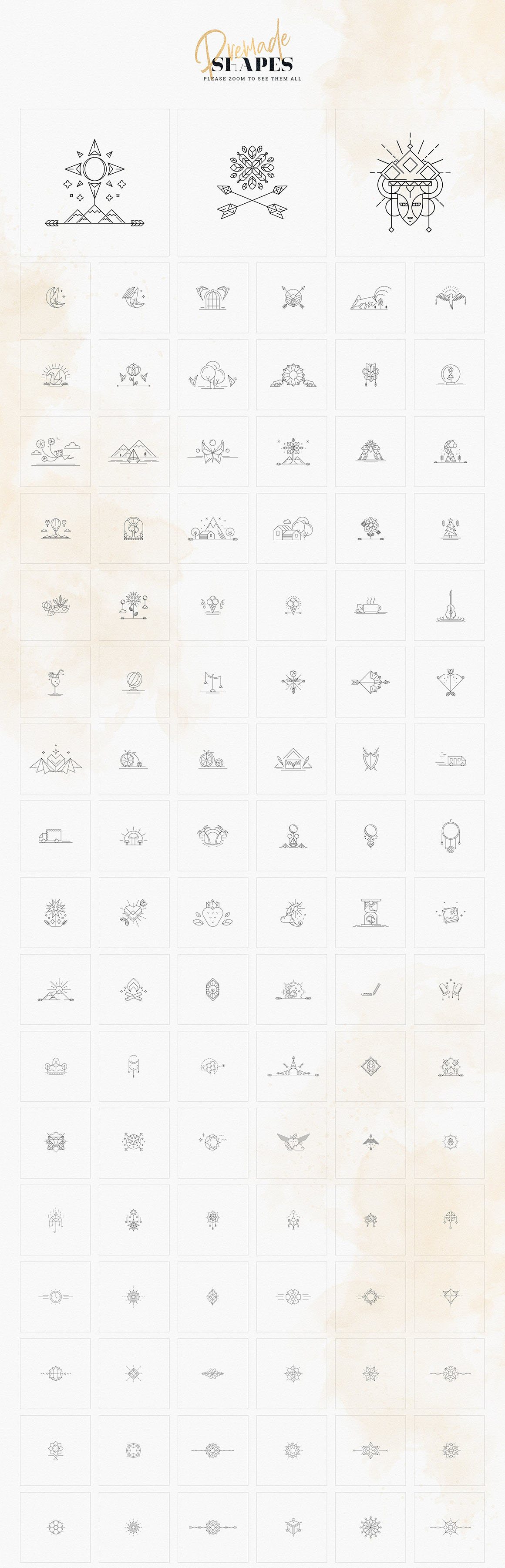 Premade logo templates, shapes, elements, photoshop styles, watercolour washes, font combinations – basically everything you need for your next line art branding project!