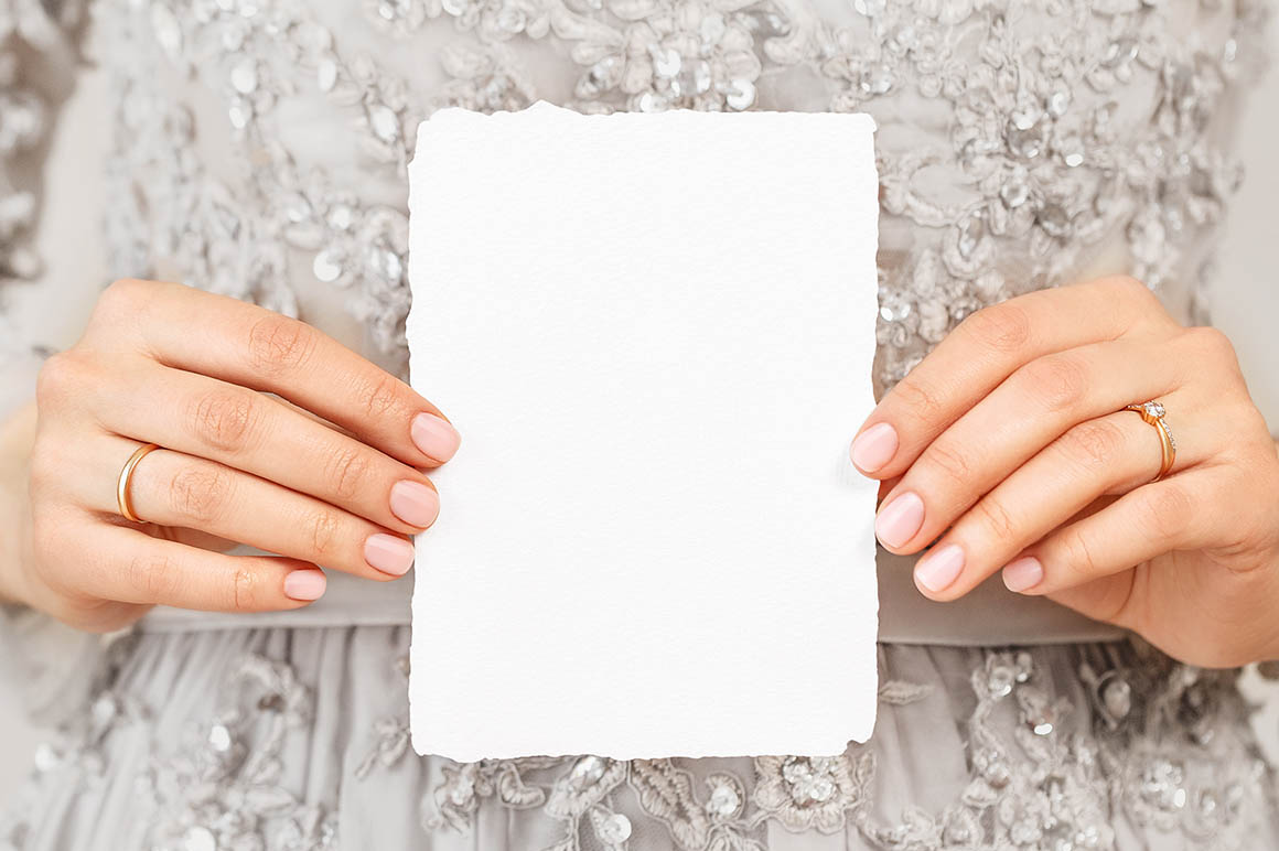 Bride holding vertical paper card (straight cut & deckle edges)- presentation & branding mock-up template from Lena Zakharova. Download and enjoy 😉