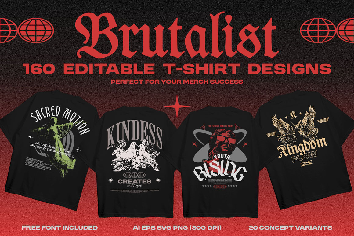 Elevate your merch game with Brutalist – 160 Editable T-Shirt Designs, crafted for creators, streetwear brands, and entrepreneurs who want to stand out in today’s bold fashion culture. This premium collection features 20 unique concept variants, each fully editable, giving you endless possibilities to customize and adapt every design to your vision. Whether you’re building your own clothing label, launching a merch line, or creating striking prints for your store, Brutalist delivers the perfect foundation for success.