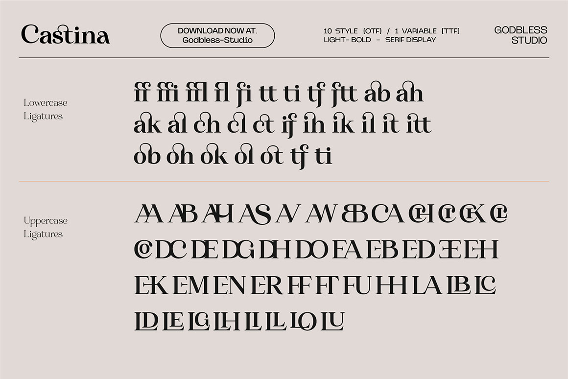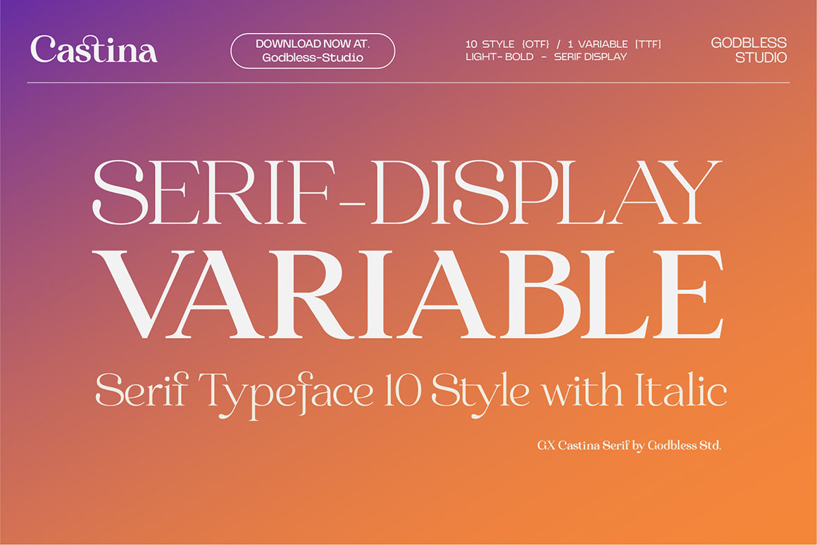 Castina Serif – Variable Font from Godbless Studio contains 10 multilingual fonts for your new modern or futuristic projects + 1 variable font file with all styles! Don’t miss this trendy & sharp style branding font 😉