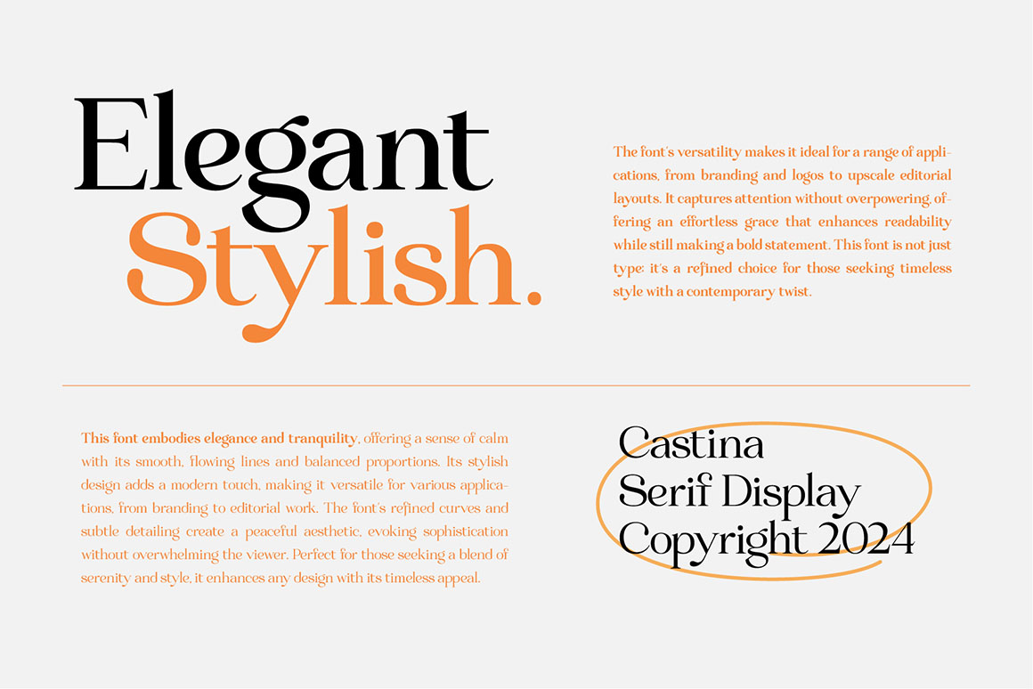 - Distinctive Character: Castina features a refined and stylish design with smooth lines and dynamic shapes. Its modern yet timeless appearance makes it ideal for creating memorable and professional visual identities.