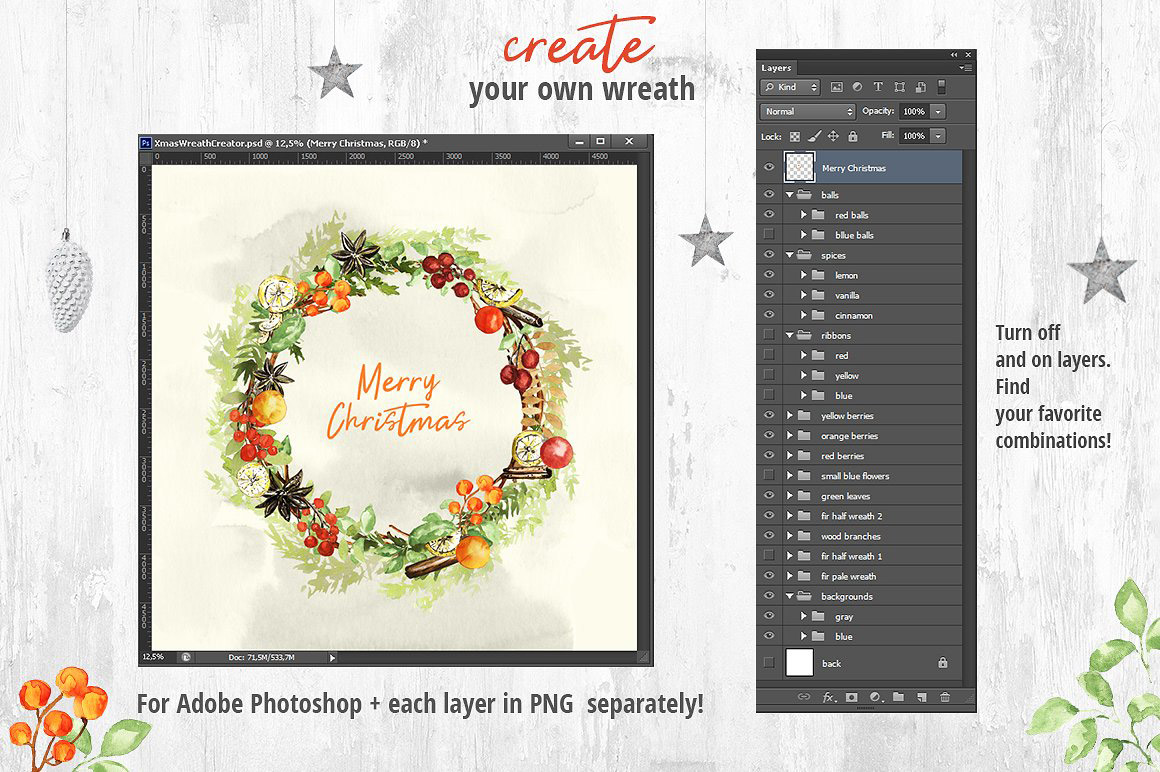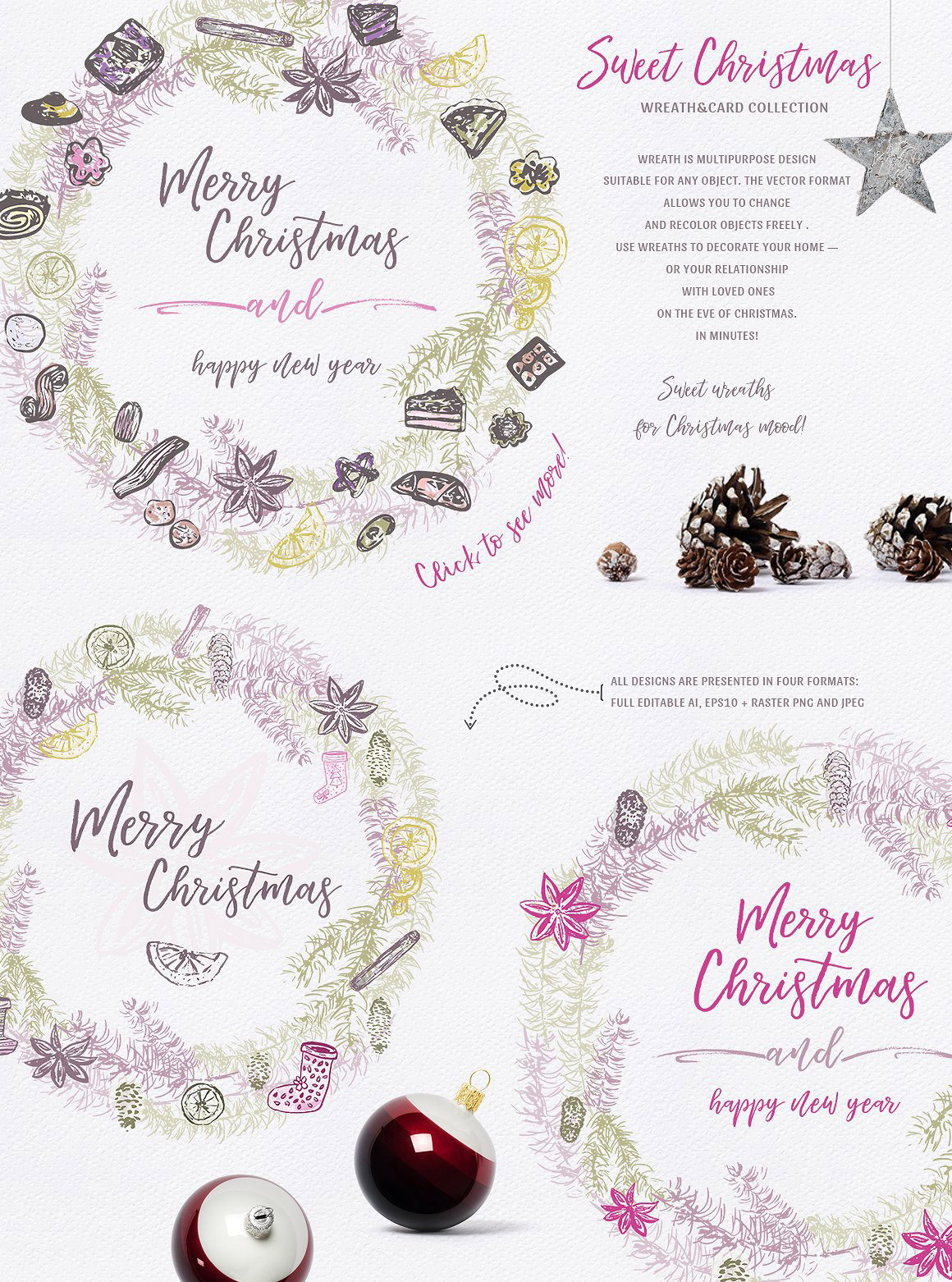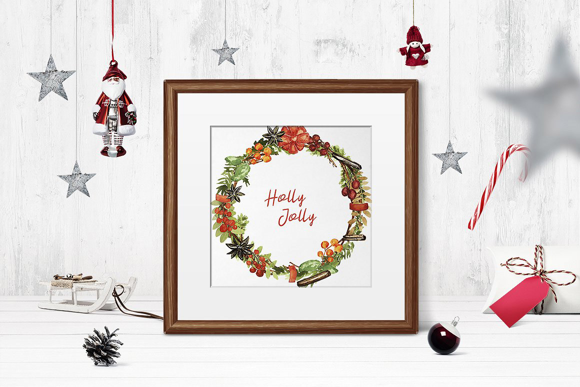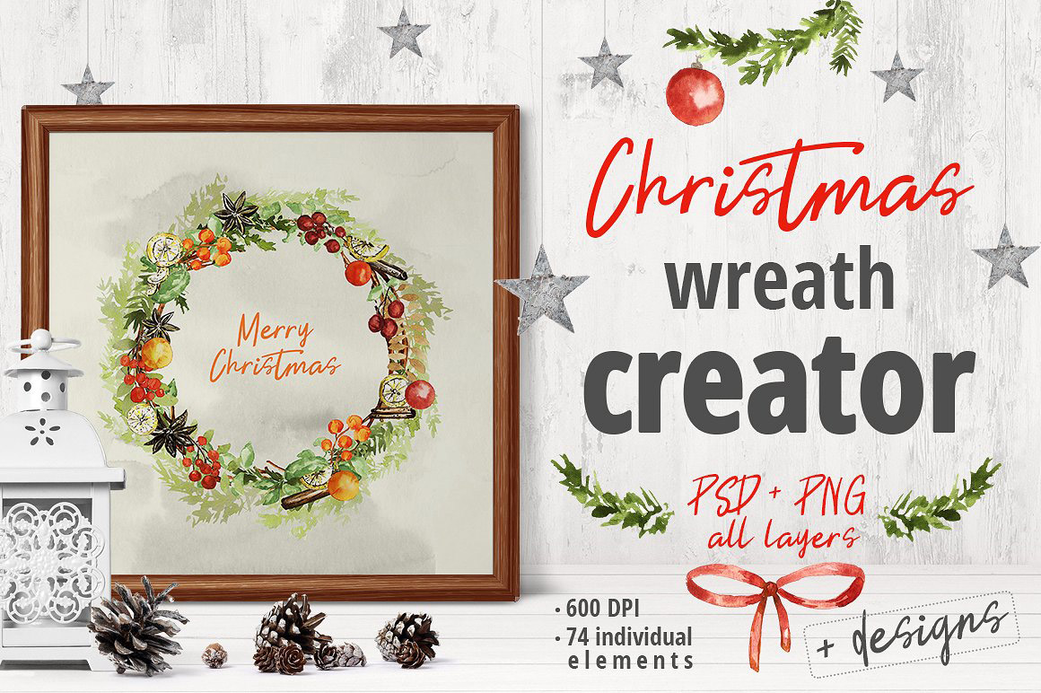 Bright colors will give a wonderful mood and decorate any objects – postcards, textile, cups, posters, bags, stickers, T-shirts. Pre-designed pieces help you to create an awesome design quickly and efficiently. Wreath is multipurpose design suitable for any object. The vector format allows you to change and recolor objects freely. Use wreaths to decorate your home on the eve of Christmas. In minutes!