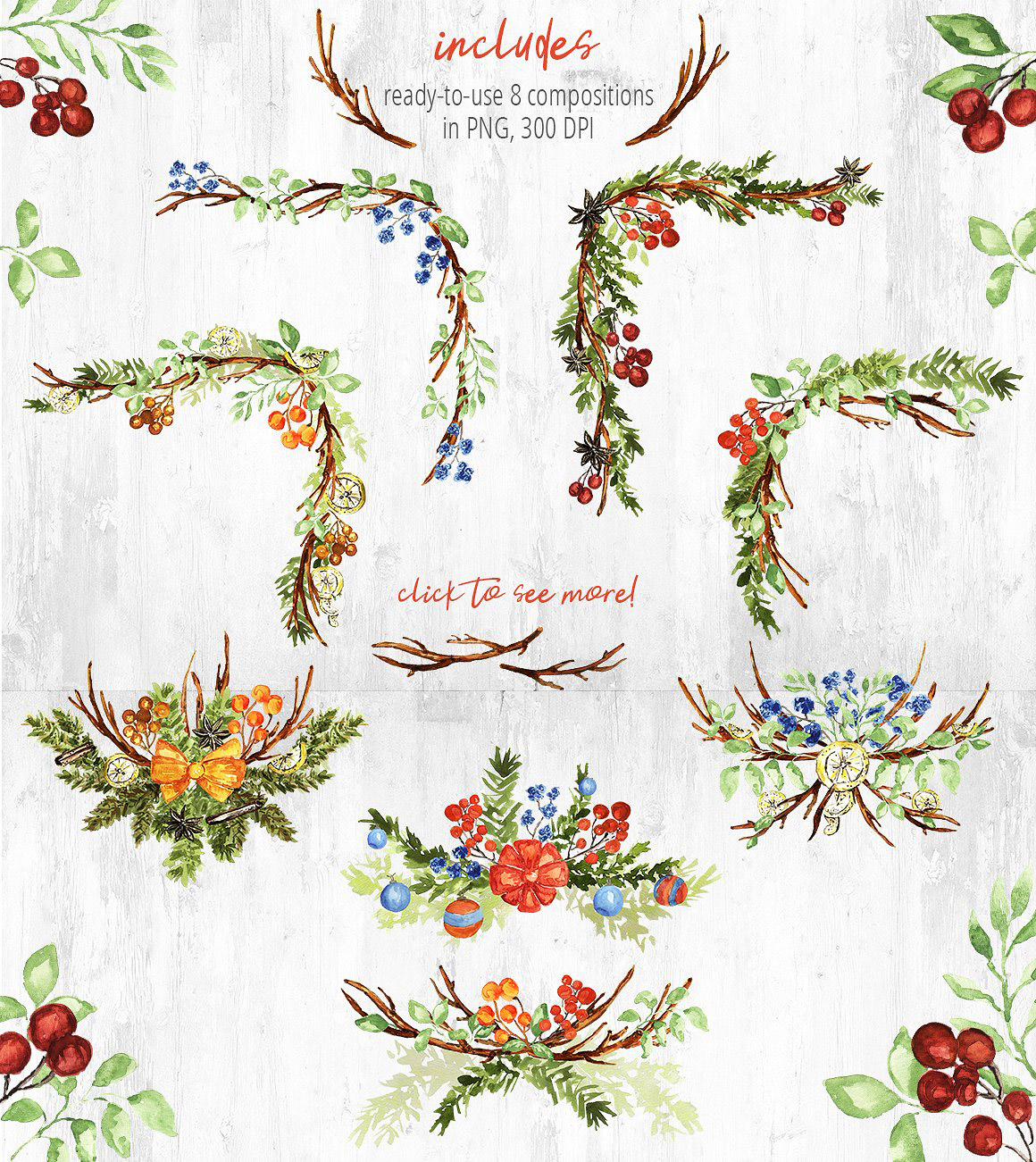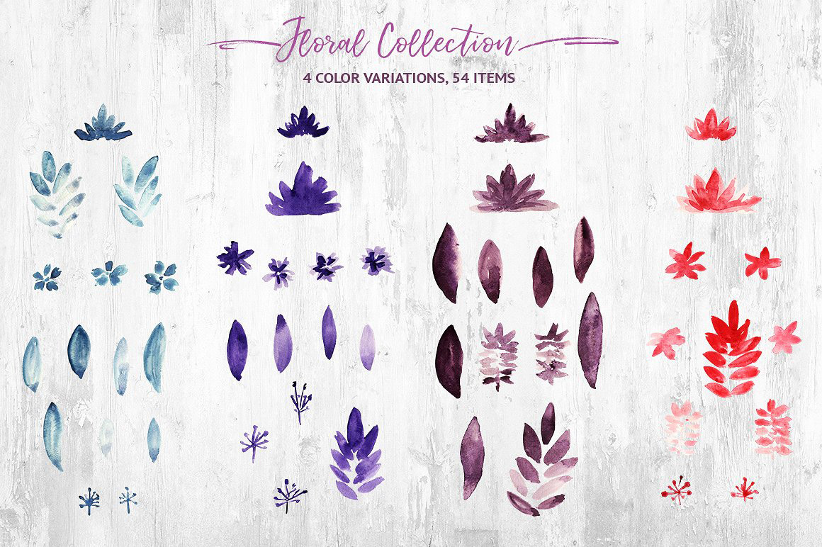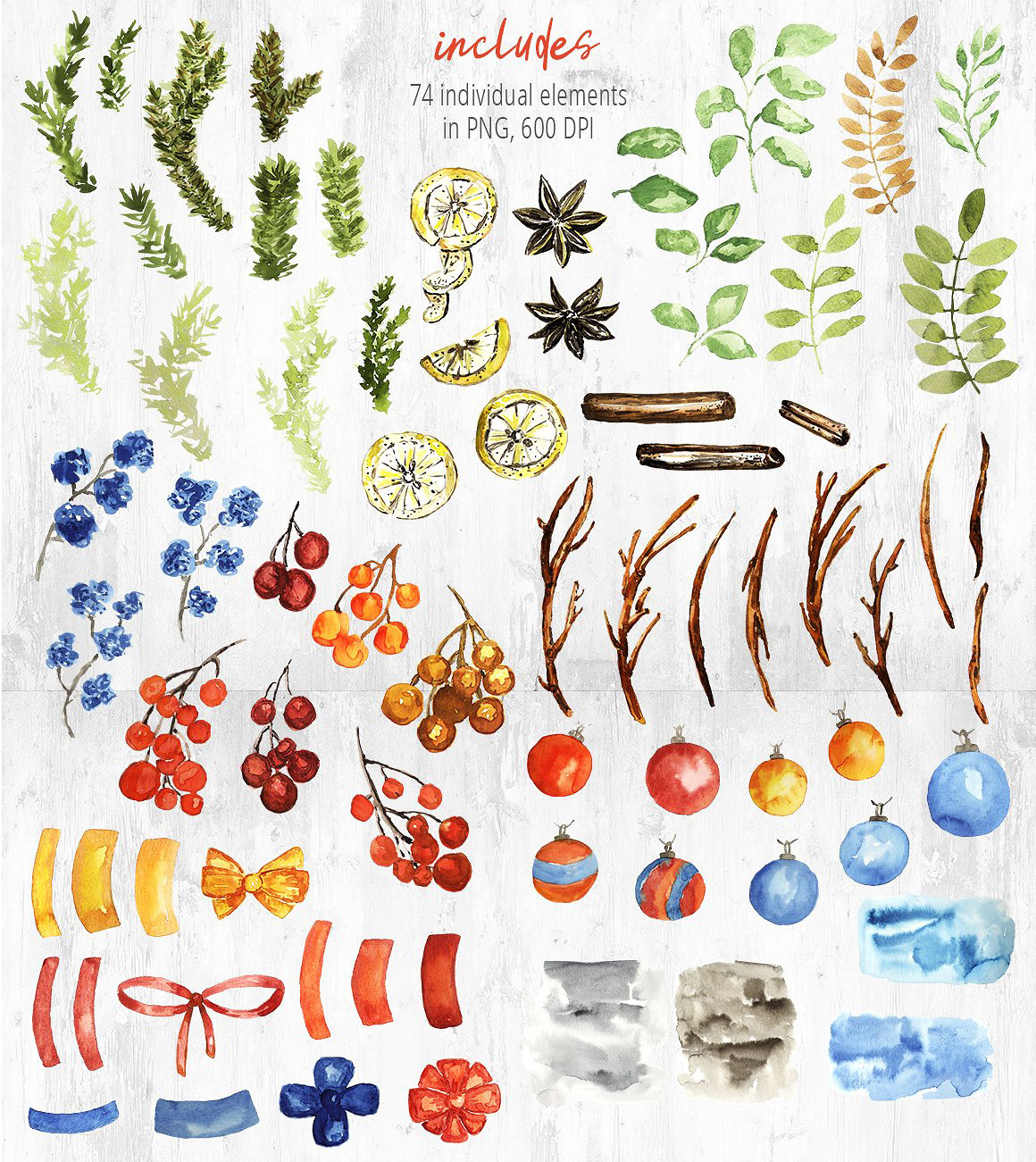 It includes watercolor hand painted floral elements, spices, berries and more! This is a great tool to create a special design in a single style. Besides, it’s fun and interesting. Find the combinations that you like!
