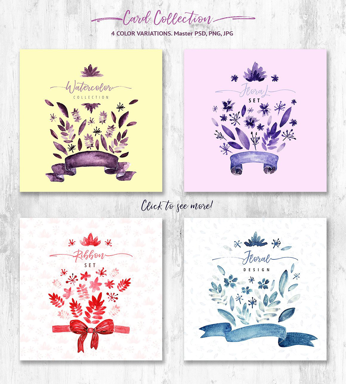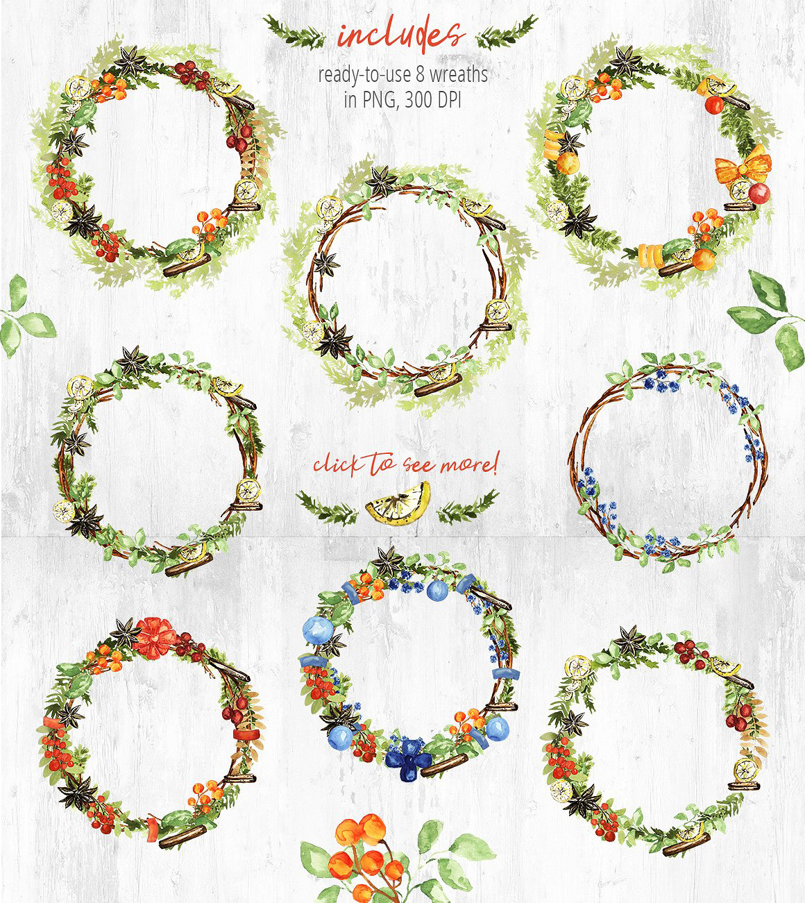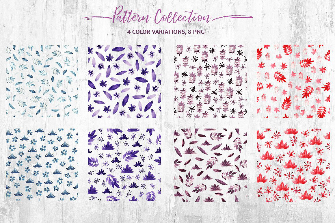 It includes watercolor hand painted floral elements, spices, berries and more! This is a great tool to create a special design in a single style. Besides, it’s fun and interesting. Find the combinations that you like!