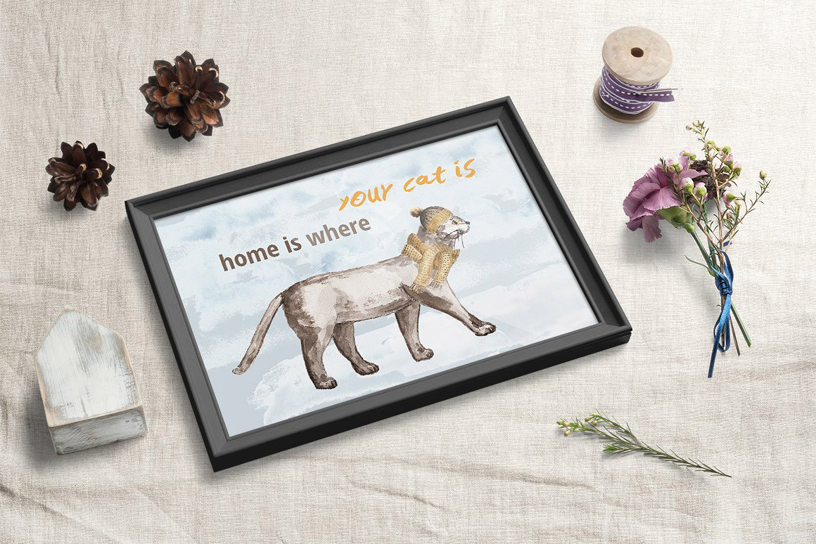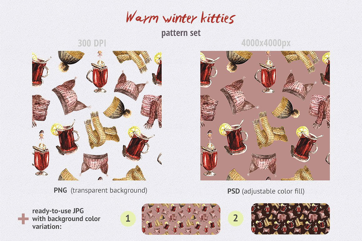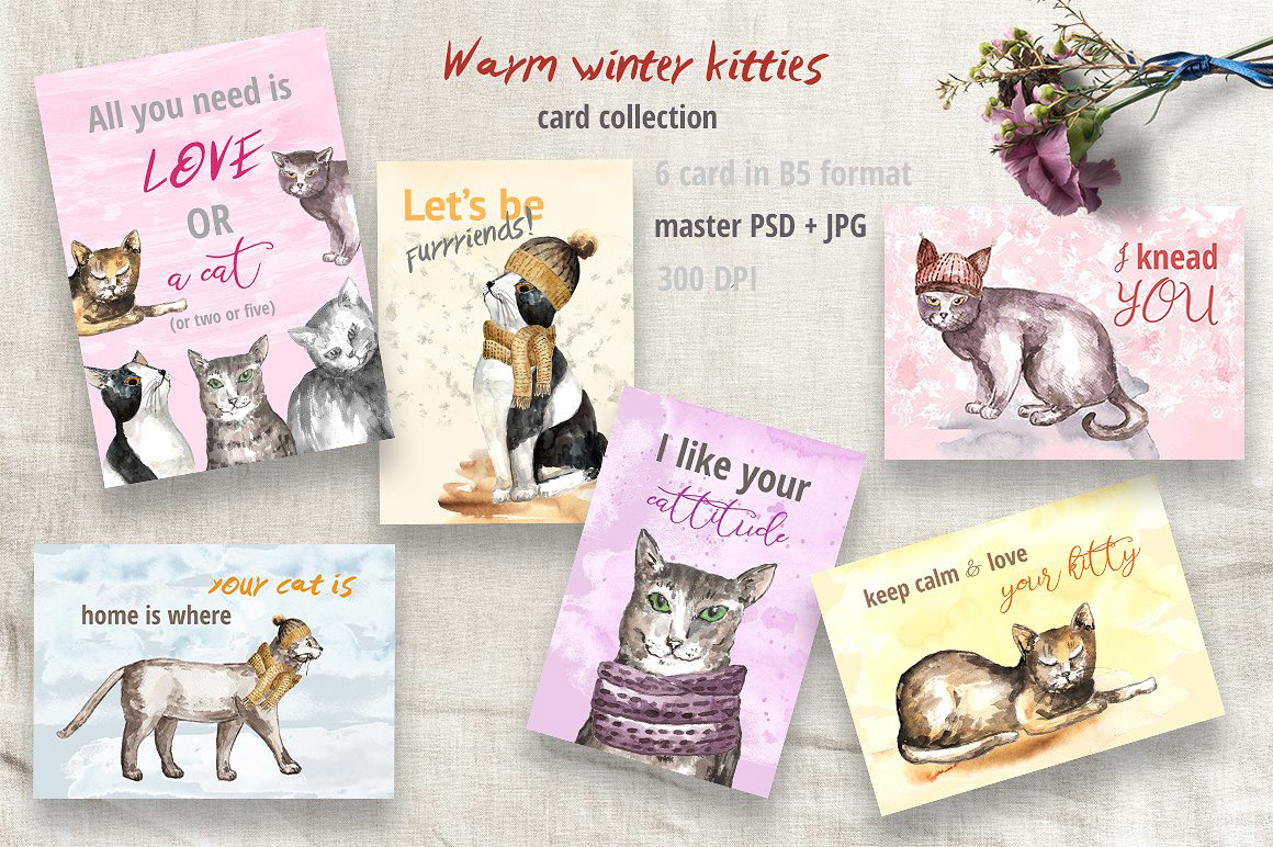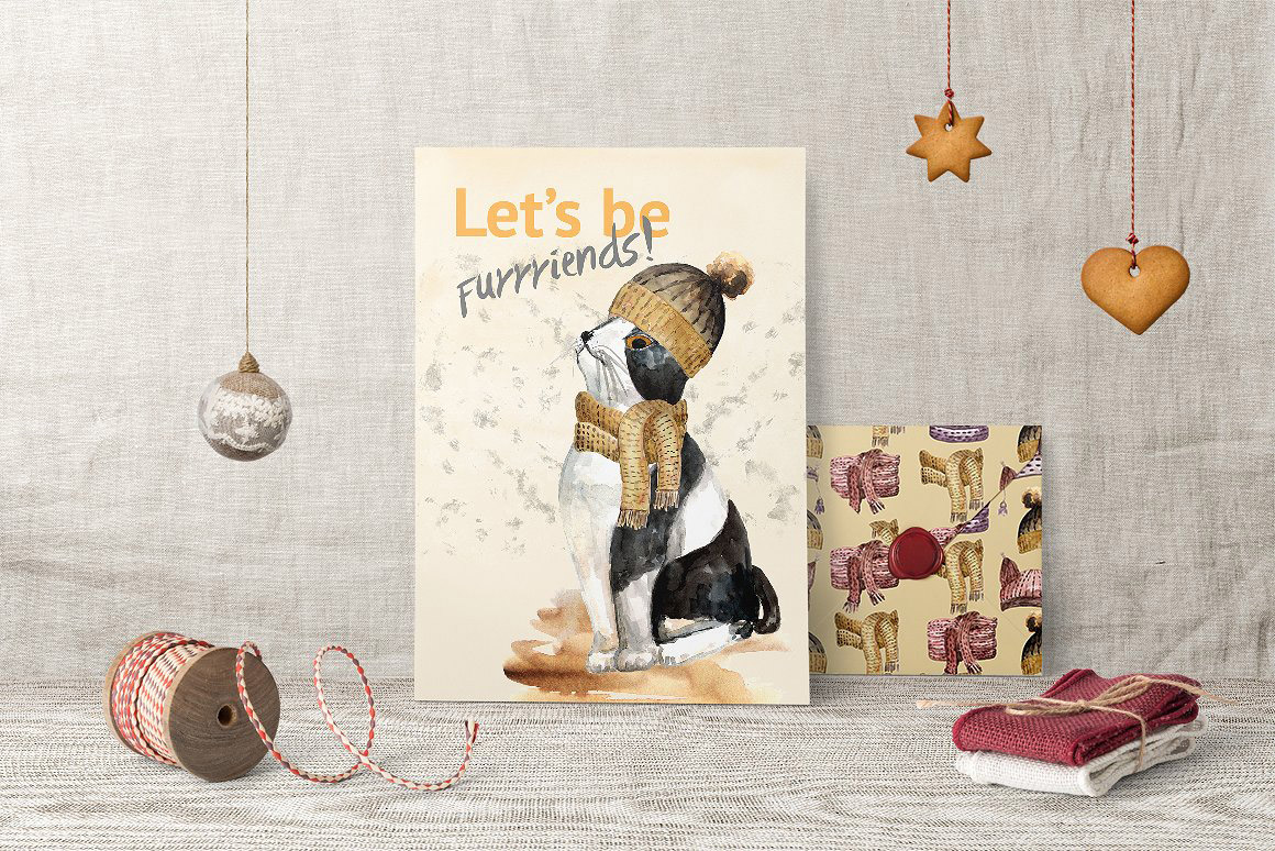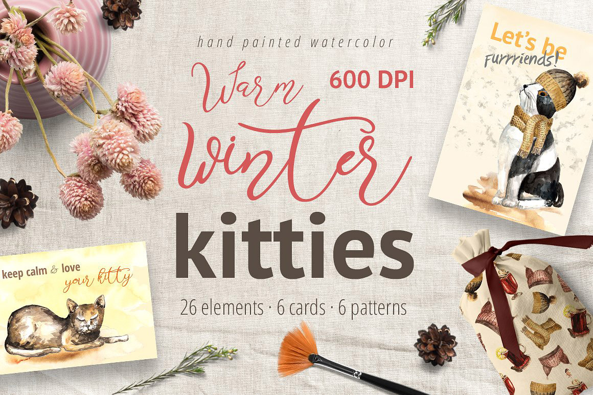 Watercolor hand painted set. It is dedicated winter time and lovely pet, which never let us freeze! Bright colors will give a wonderful mood and decorate any objects – postcards, textile, cups, posters, bags, stickers, T-shirts. Pre-designed pieces help you to create an awesome design quickly and efficiently.