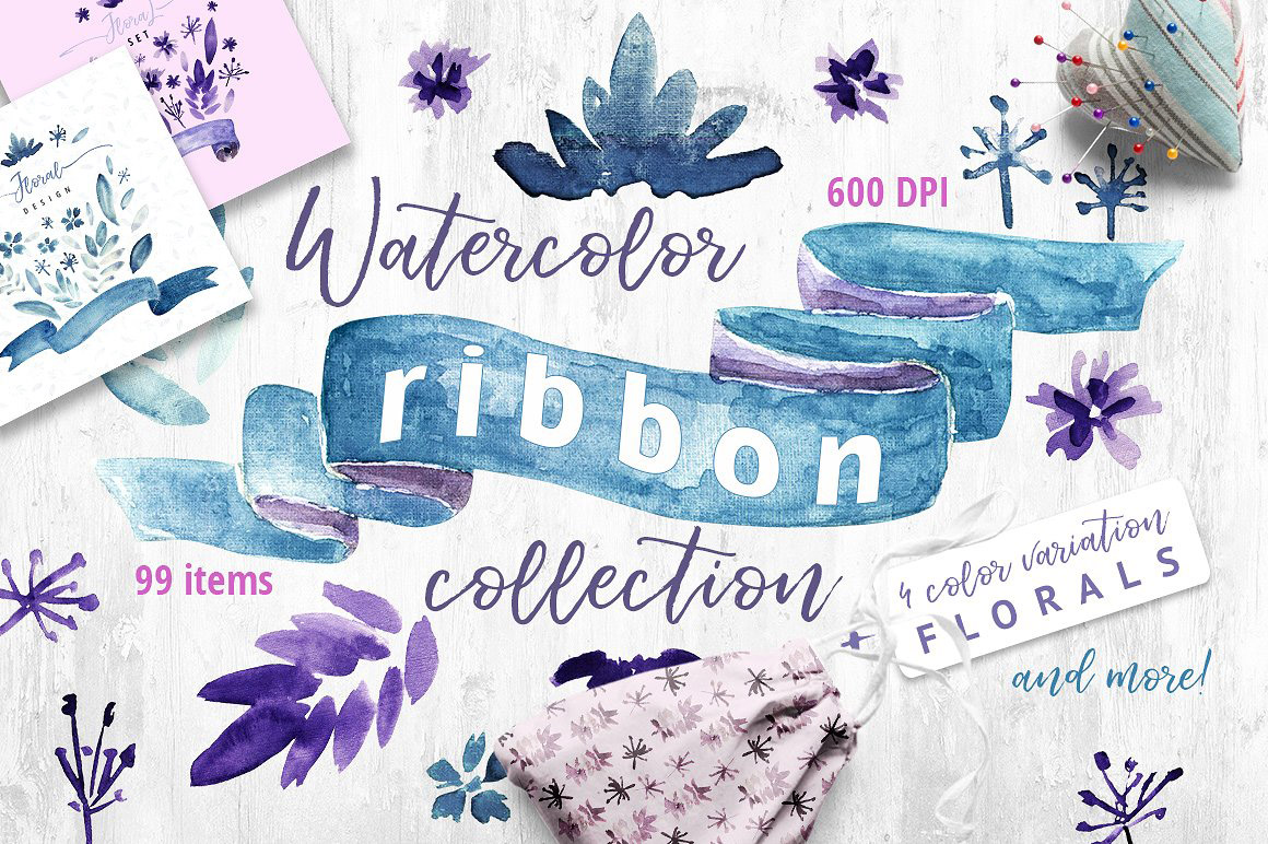 Set includes 99 watercolor elements in PNG, 600 DPI: