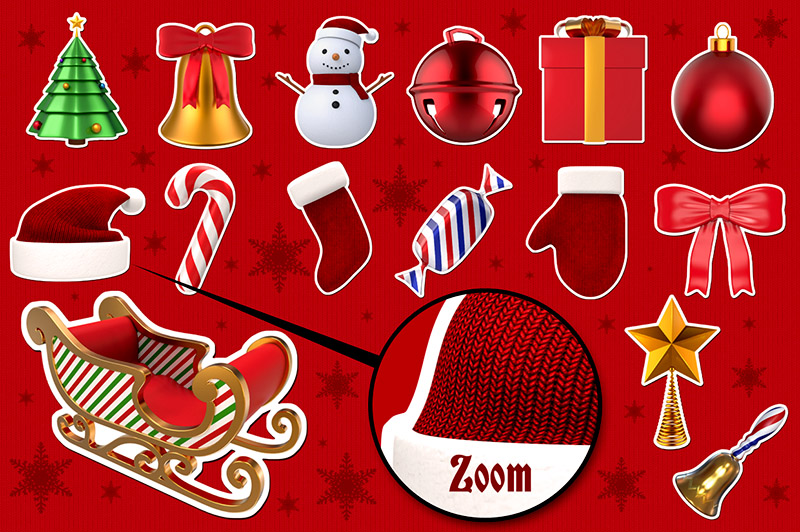 3D Christmas Stickers: Christmas tree, bell, snowman, reindeer bell, christmas bulb, santa hat, candy cane, glove, stocking, santa sleigh, star, santa bell, candy, gift and bow. Format: Transparent PNG (15 different files). Size: 1024, 512, 256 and 128 px.