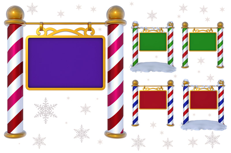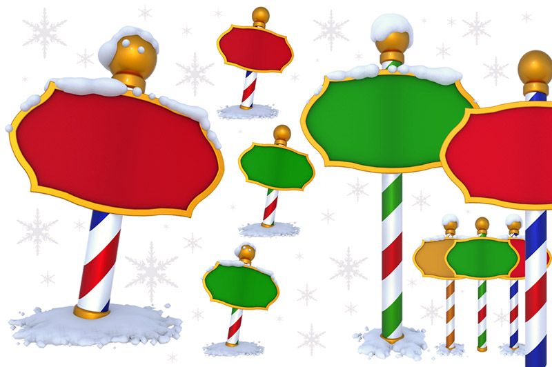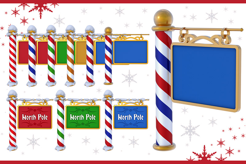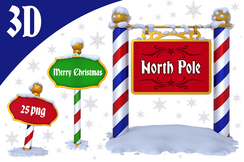3D North Pole signs in different positions and colors. 25 Transparent PNG files – Size between 1300-1500px