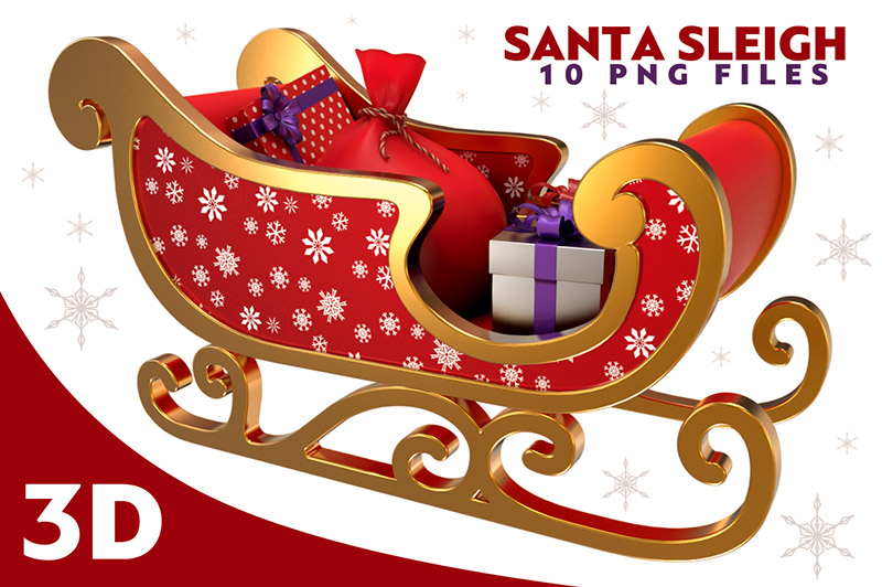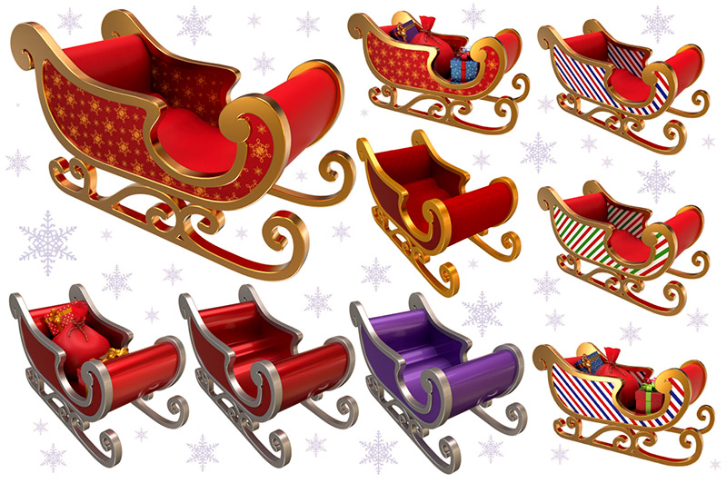 Santa Sleigh – 3D. 10 Transparent PNG files with a santa sleigh in different position and colors, empty and with gifts. Size 1400x1400px.