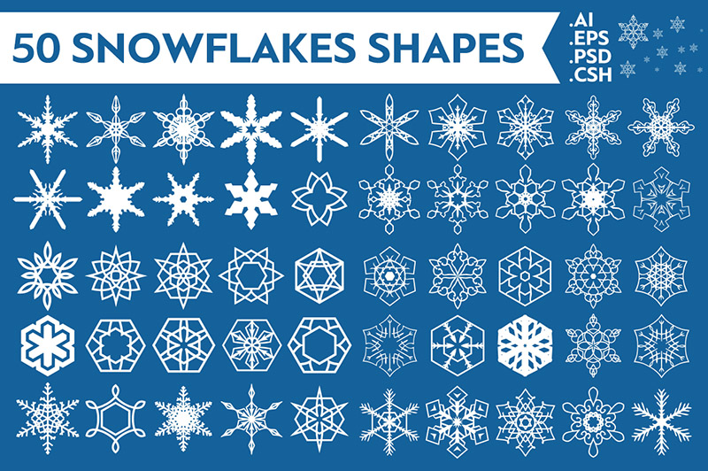50 Snowflakes Vector Shapes. Format: Ai, Eps, PSD, CSH (Photoshop Custom Shapes).