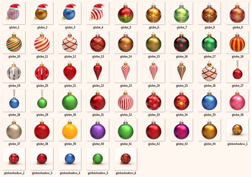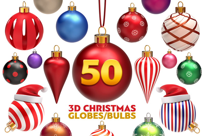 50 Christmas Globes/Bulbs – 3D Renders. 44 Transparent Png – 1200px & 6 Jpg – 1600px.