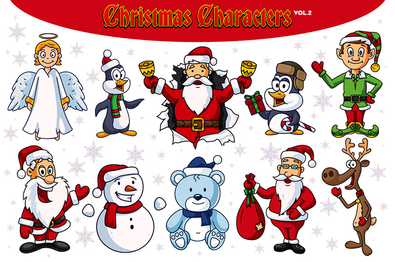 10 vector Christmas characters like santa, reindeer, penguin, elf. Format: Vector Ai, Vector Eps, HQ Jpg 2480x3508px 300ppi, Transparent Png 800x1132px 72ppi.