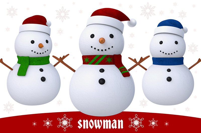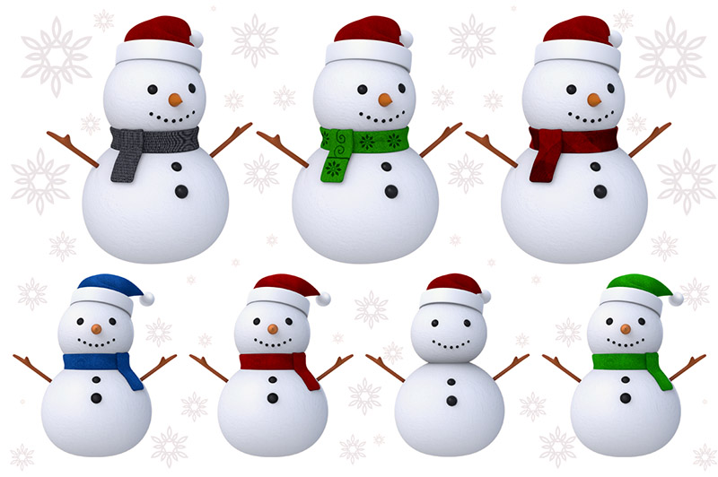 3D Snowman wearing scarf and santa hat in different colors. 10 transparent PNG files at 1300×1300 px.