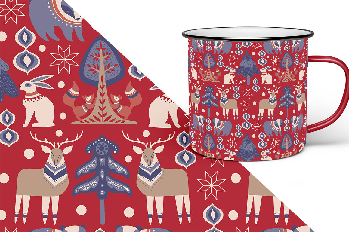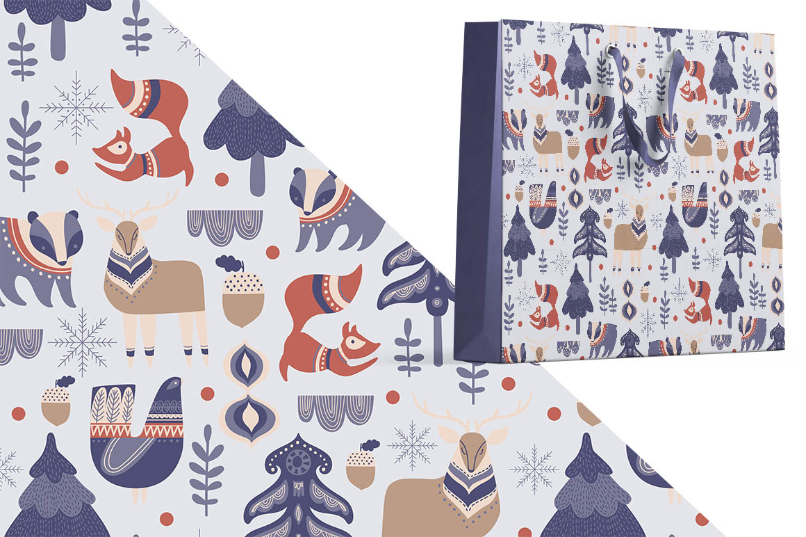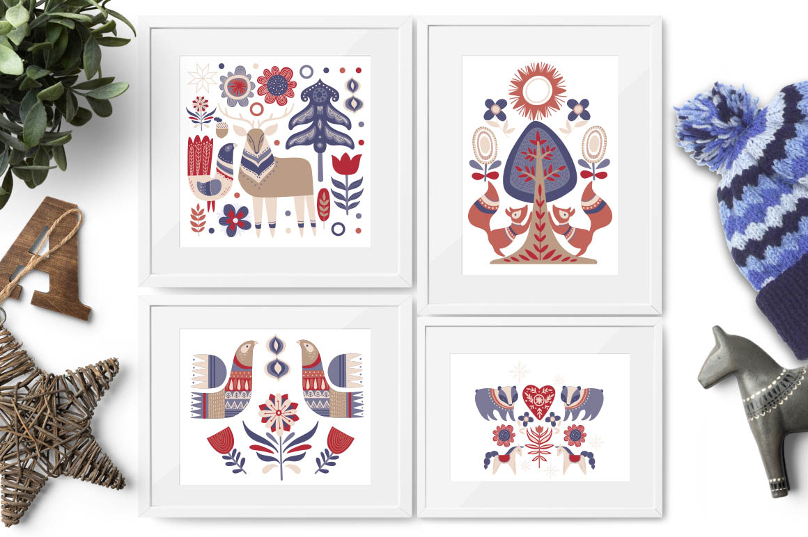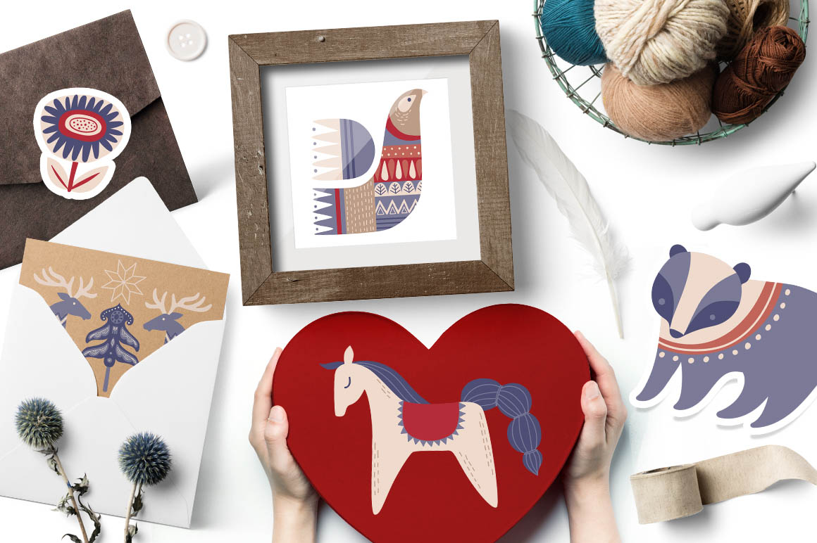 Scandinavian Winter cards, clipart and patterns in nordic folklore style. This winter set is great for stylish Сhristmas. 80 vector and raster elements: deers, birds, fox, bear, rabbit, decorations for a Christmas tree, trees and plants, flowers. You will also get 4 seamless patterns and 4 greeting cards. Create your Scandinavian Christmas!