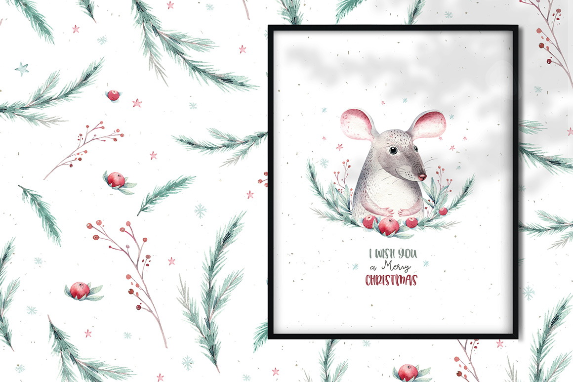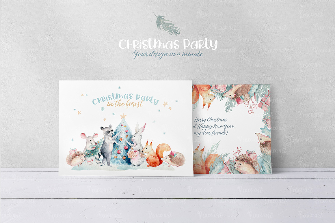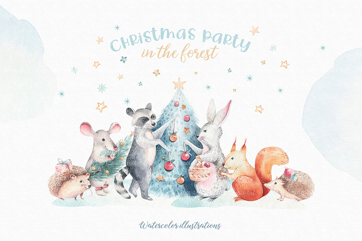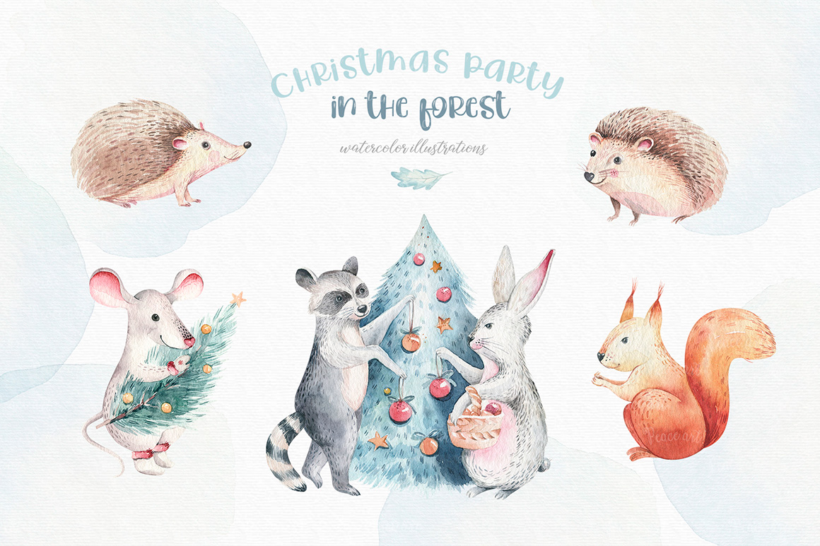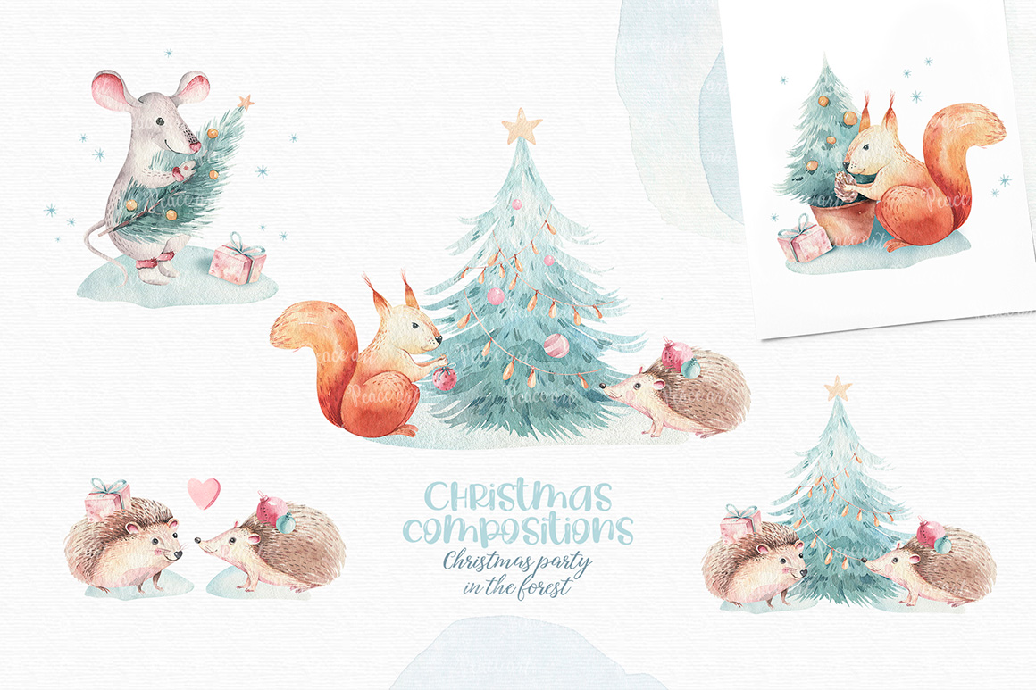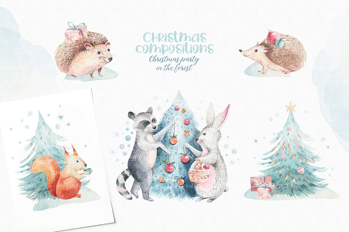 This set of high quality hand painted watercolor winter elements. Christmas party in the forest. Cute watercolour animals.