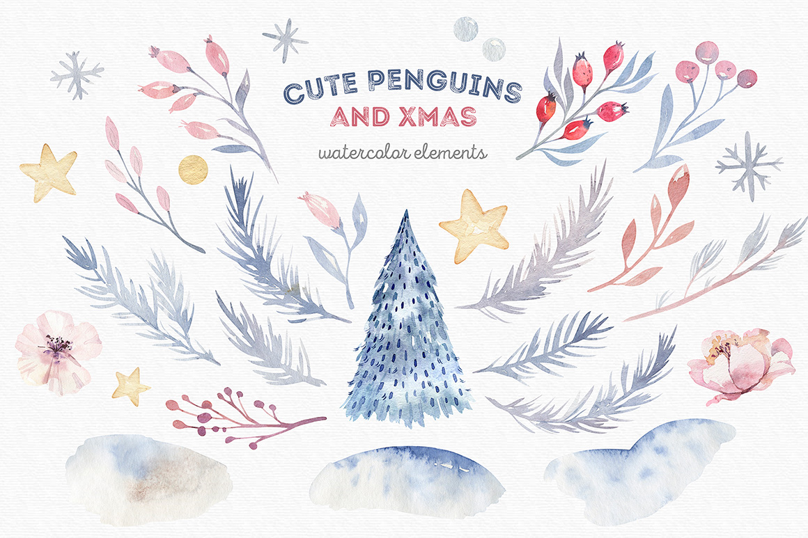 - 20 + watercolor winter elements, see preview (300 dpi, PNG, transparent background)
