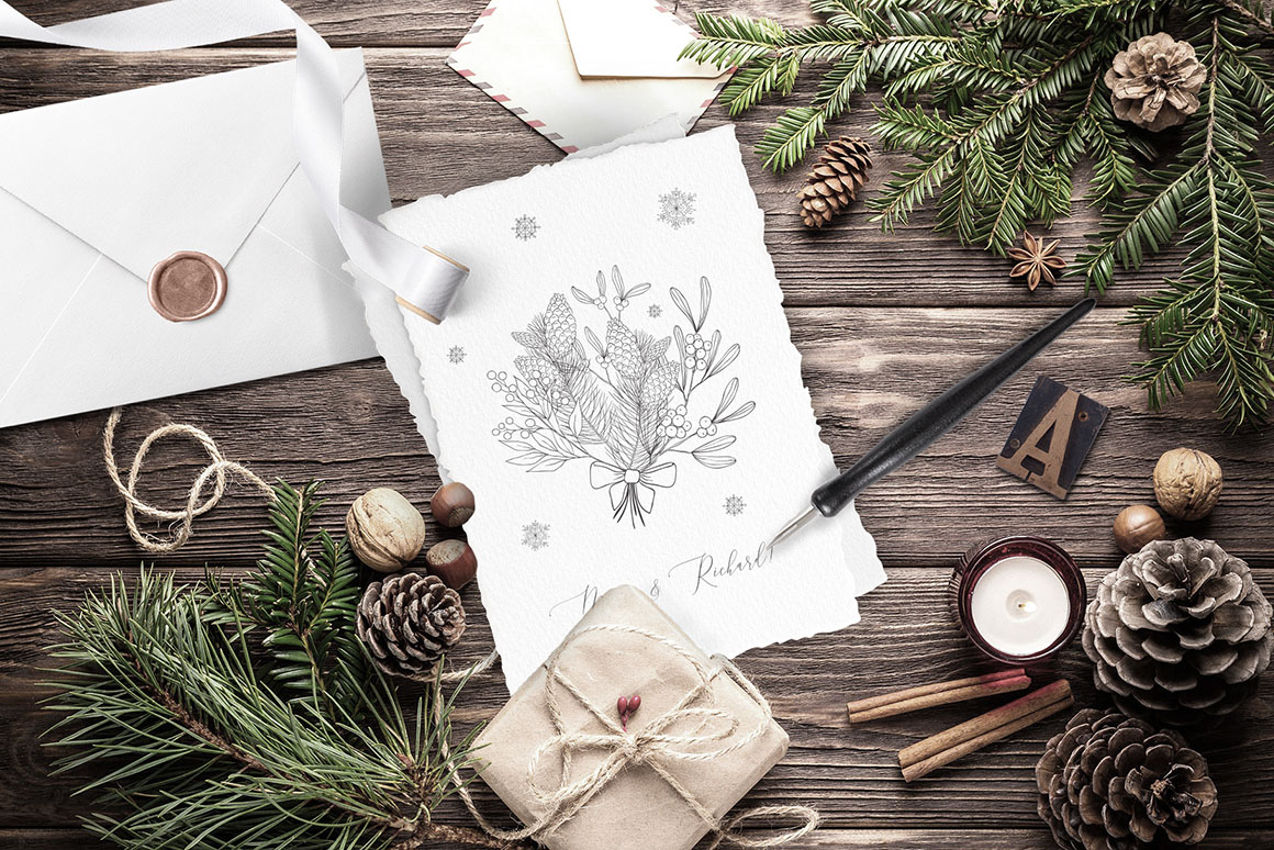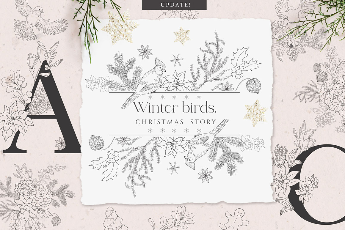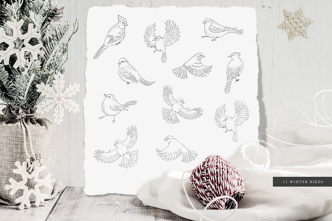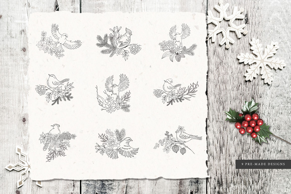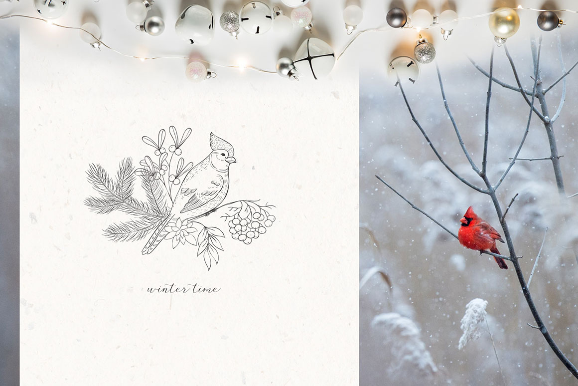 Here is a new collection “Winter birds. Christmas Story.” with Hand Drawn Floral Botanical Design Elements of winter plants in modern line art style, Birds, Frames, Wreaths, Bouquets, Pre-made designs. The graphics are great for logo, branding, decor, decoration, invitation, wedding design, packaging, greeting cards and more.