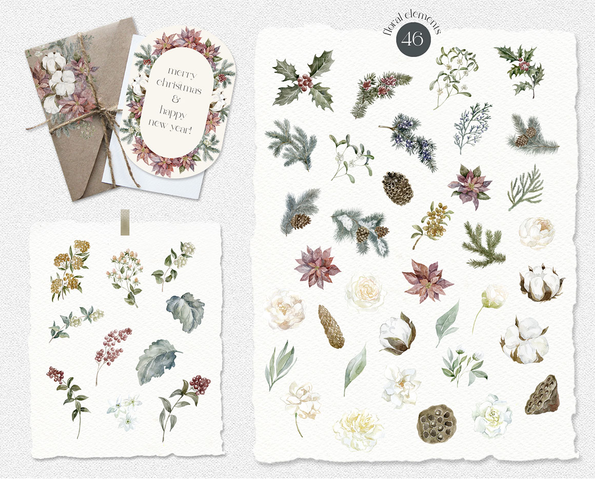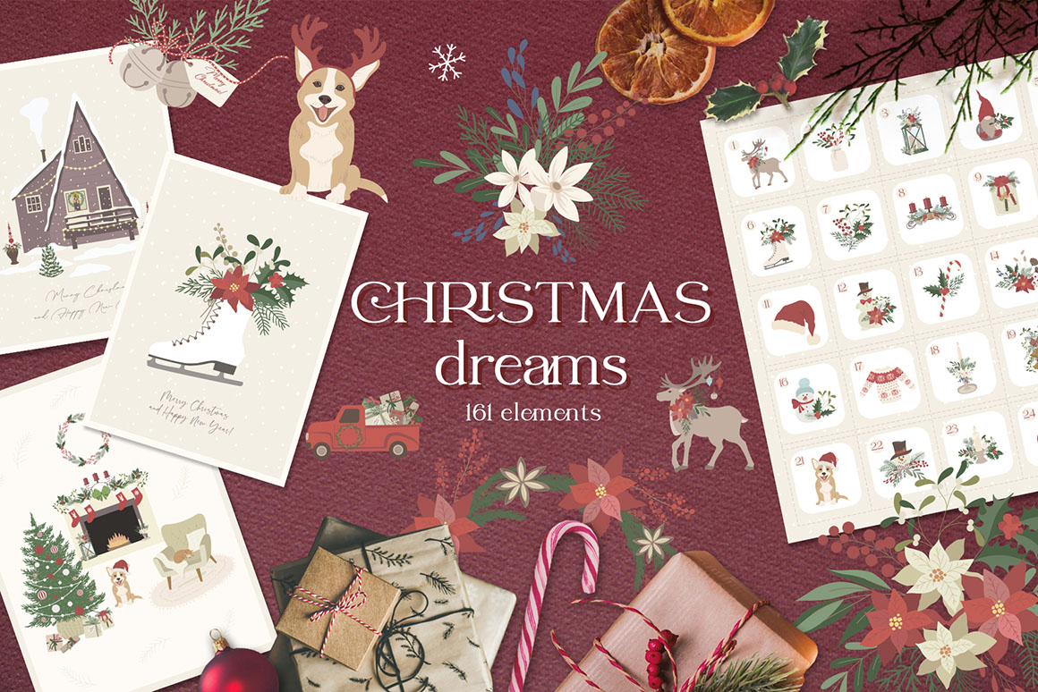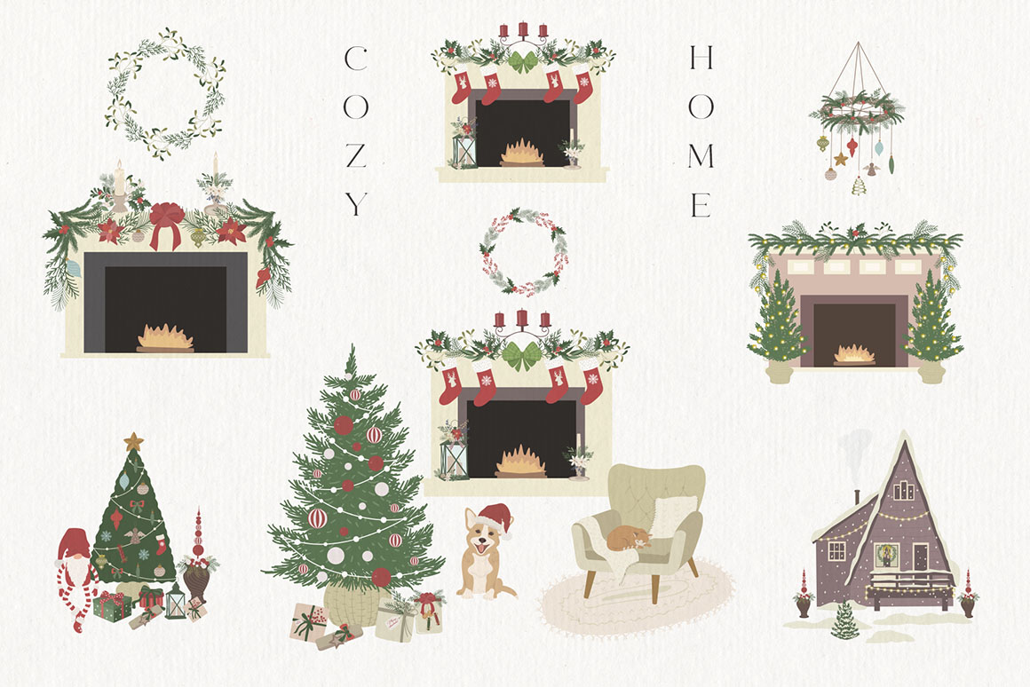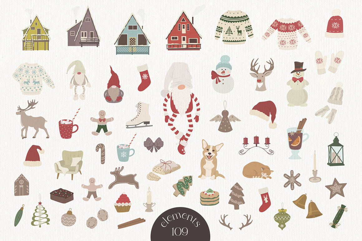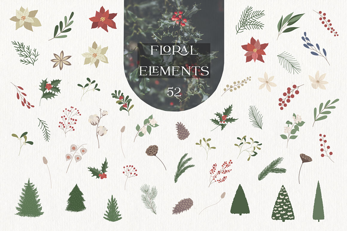 Here is a new Christmas and New Year collection with vector & raster Design Elements in holiday colors. It includ beautiful and stylish Christmas cards, Pre-made designs, Frames, Wreaths, Bouquets, Patterns, Advent calendar, home interior, animals. That are great for holiday design, logo, branding, decoration, packaging, fabric printing, cards and more.