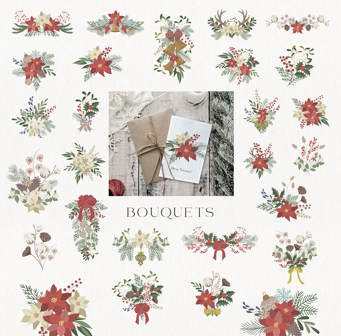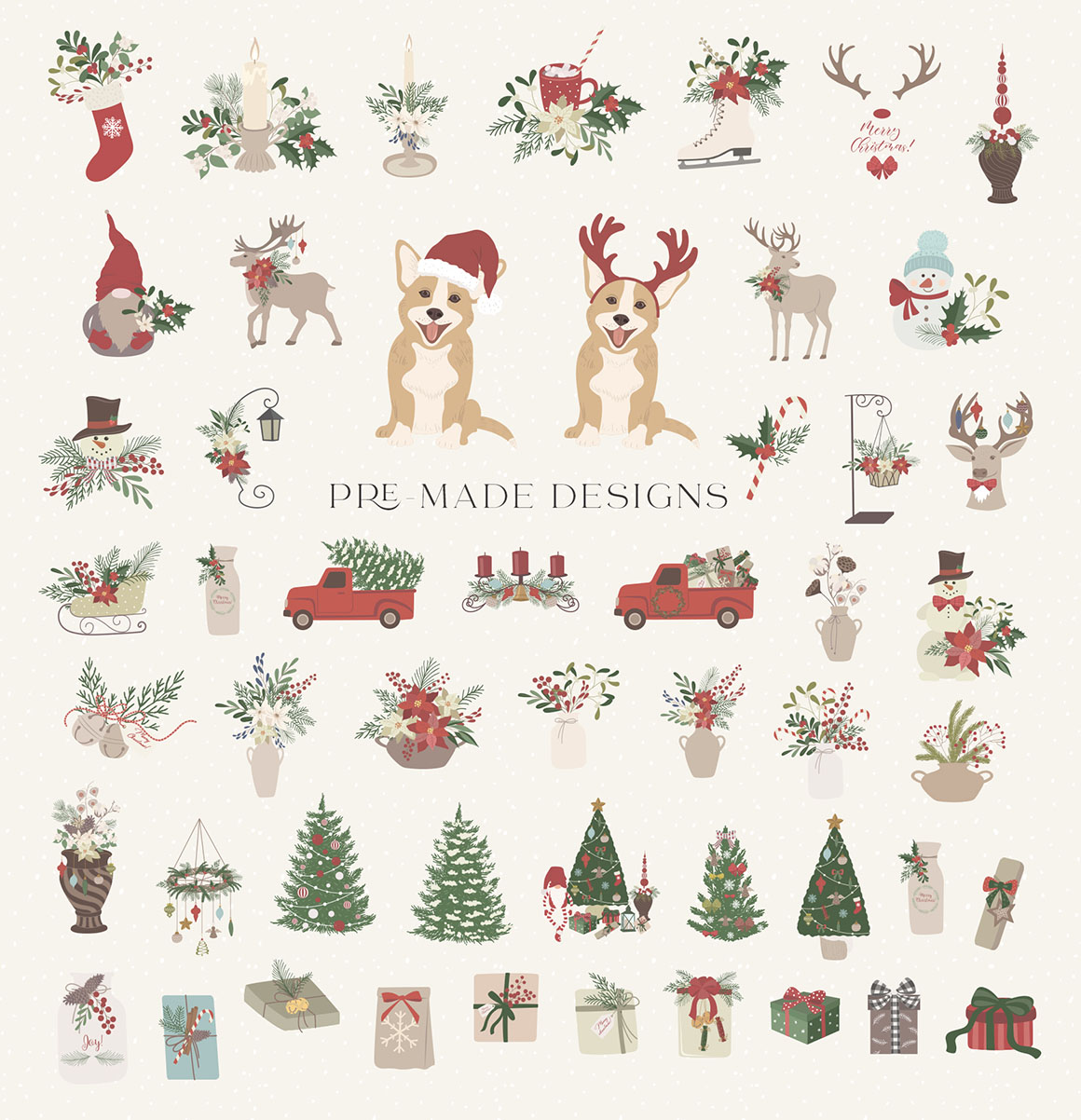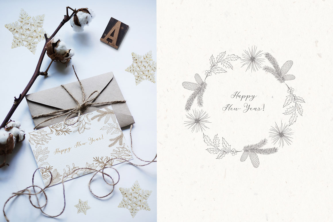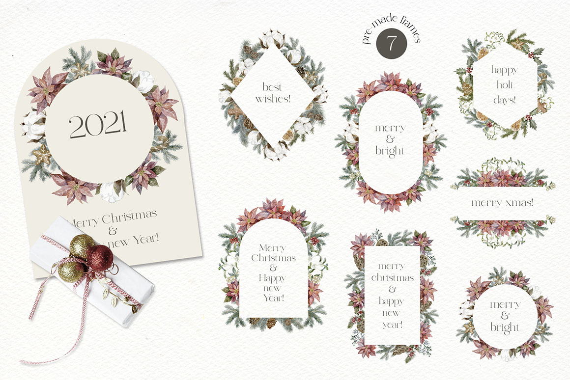 Here is a new Christmas and New Year collection with vector & raster Design Elements in holiday colors. It includ beautiful and stylish Christmas cards, Pre-made designs, Frames, Wreaths, Bouquets, Patterns, Advent calendar, home interior, animals. That are great for holiday design, logo, branding, decoration, packaging, fabric printing, cards and more.